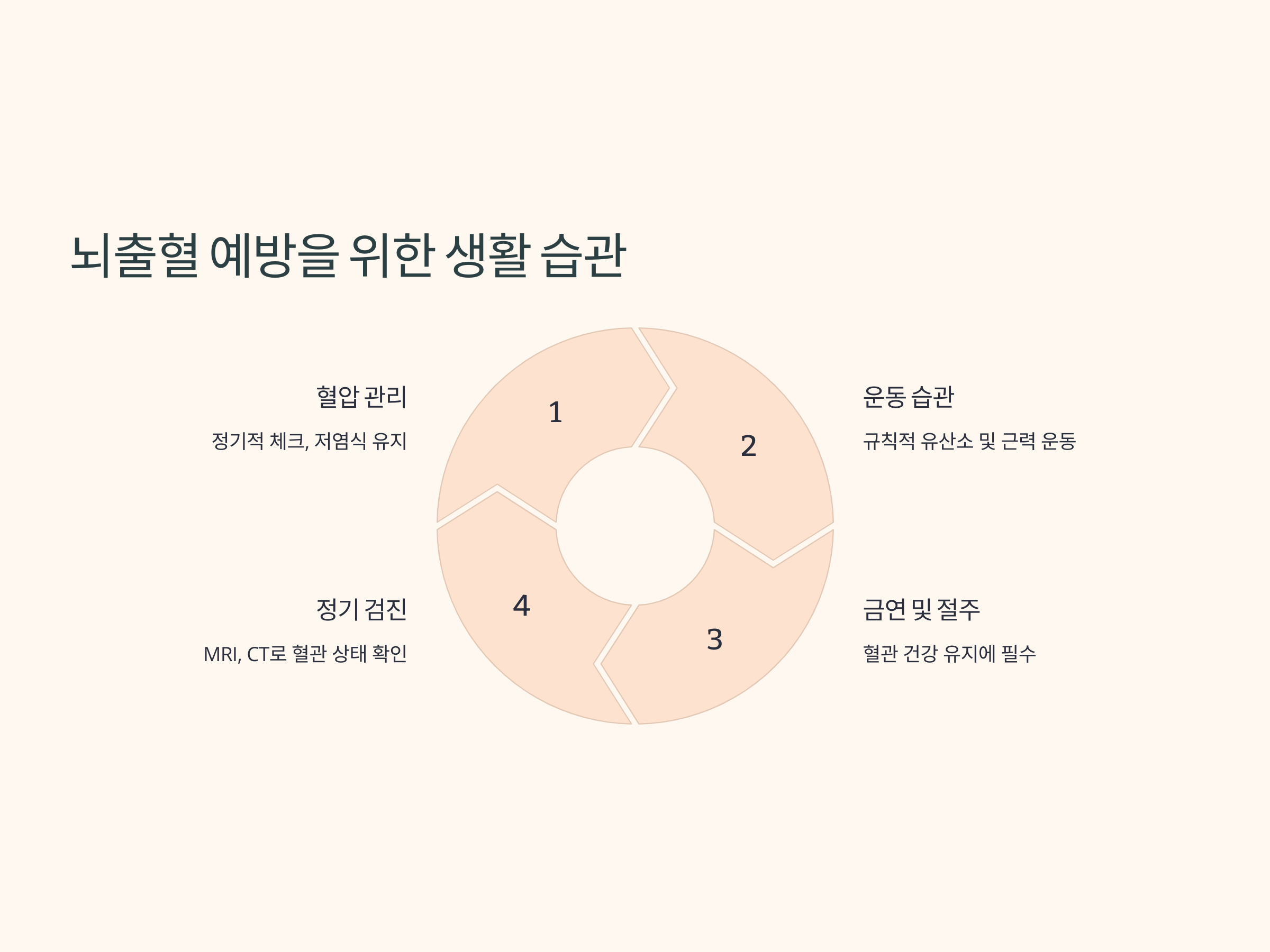 - 정기 건강검진: 뇌 MRI 및 CT 검사로 혈관 상태 확인