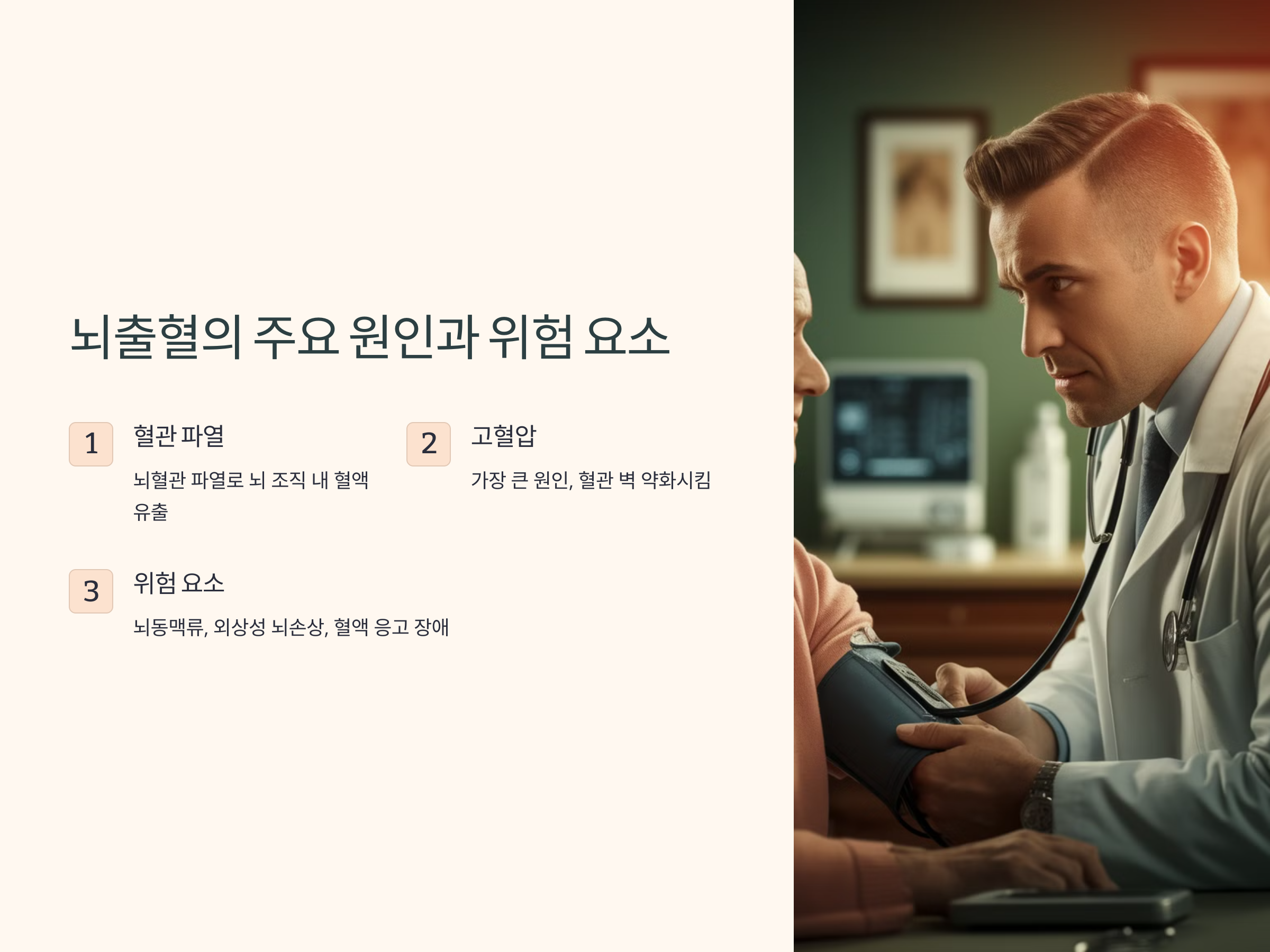 뇌출혈은 뇌혈관이 갑자기 파열되면서 뇌 조직 내로 혈액이 유출되는 상태를 의미합니다. 주요 원인은 고혈압, 동맥류 파열, 외상, 혈관 기형 등으로 다양합니다. 특히 고혈압은 가장 큰 원인 중 하나로 꼽히며, 지속적으로 높은 혈압은 혈관 벽을 약화시켜 출혈 위험을 증가시킵니다.