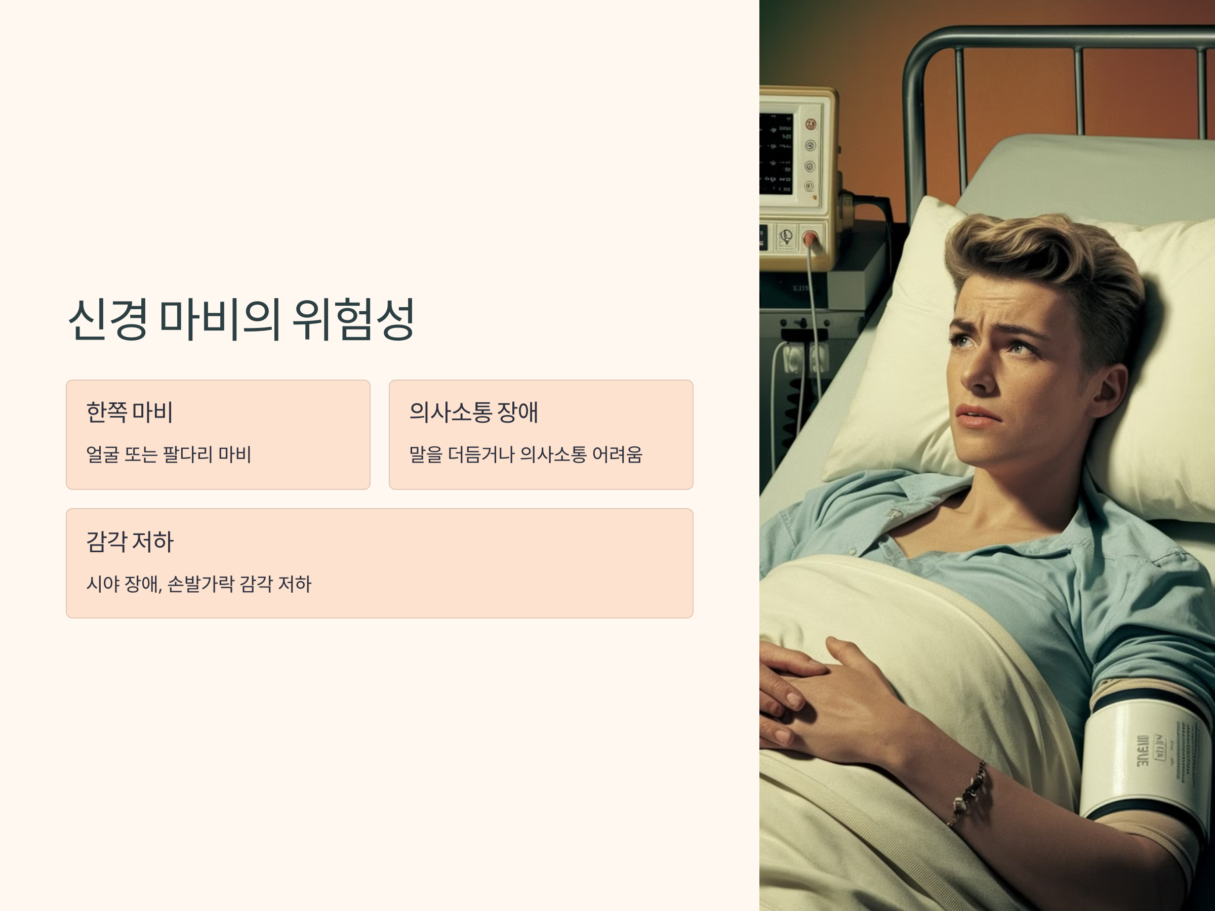 특히 한쪽 팔다리의 마비가 갑자기 발생했다면 즉시 응급실을 방문해야 합니다. 이는 뇌졸중(출혈성 뇌졸중)의 대표적인 증상이며, 신속한 치료가 없을 경우 영구적인 장애로 이어질 수 있습니다.