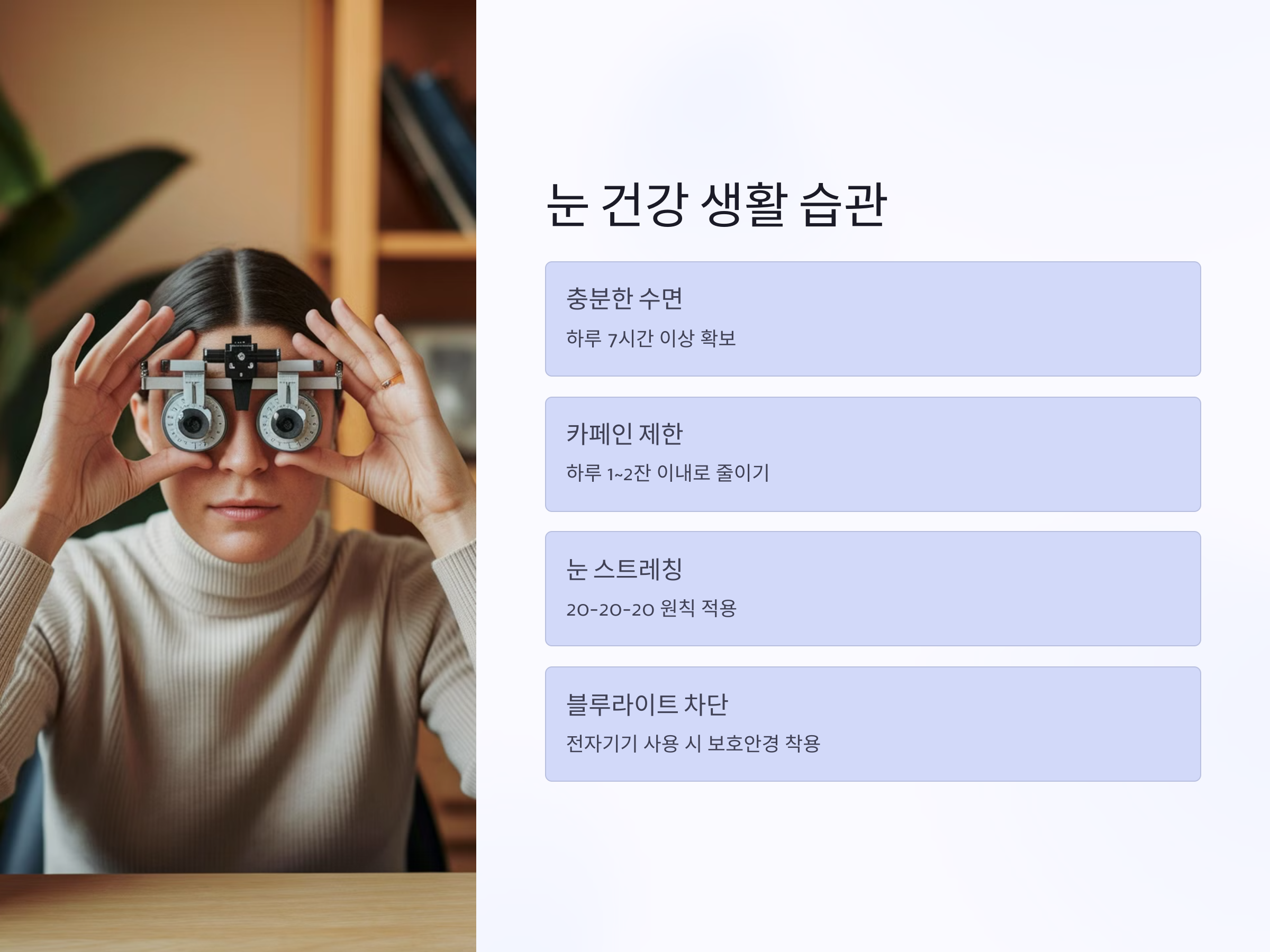 또한, 과도한 스마트폰 사용으로 인한 안구 건조와 눈의 피로도 눈꺼풀 떨림의 원인이 되므로, 20분마다 20초 동안 먼 곳을 바라보는 ‘20-20-20’ 원칙을 적용하는 것이 도움이 됩니다. 컴퓨터 사용이 잦은 직장인이라면 푸른색 계열의 블루라이트 차단 안경을 사용하는 것도 효과적입니다.