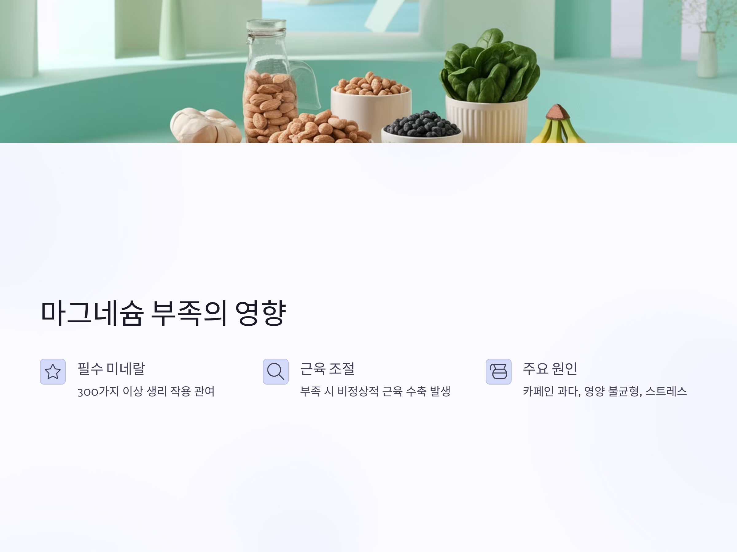 주요 원인으로는 카페인 과다 섭취, 영양 불균형, 잦은 다이어트, 만성적인 스트레스 등이 있으며, 특히 현대인에게는 식습관의 서구화로 인해 마그네슘 섭취가 부족해지는 경우가 많습니다. 일반적으로 마그네슘 부족은 혈액검사로 확인되기 어렵기 때문에 자가진단보다는 식이 조절과 보충제 섭취를 통한 예방이 중요합니다.