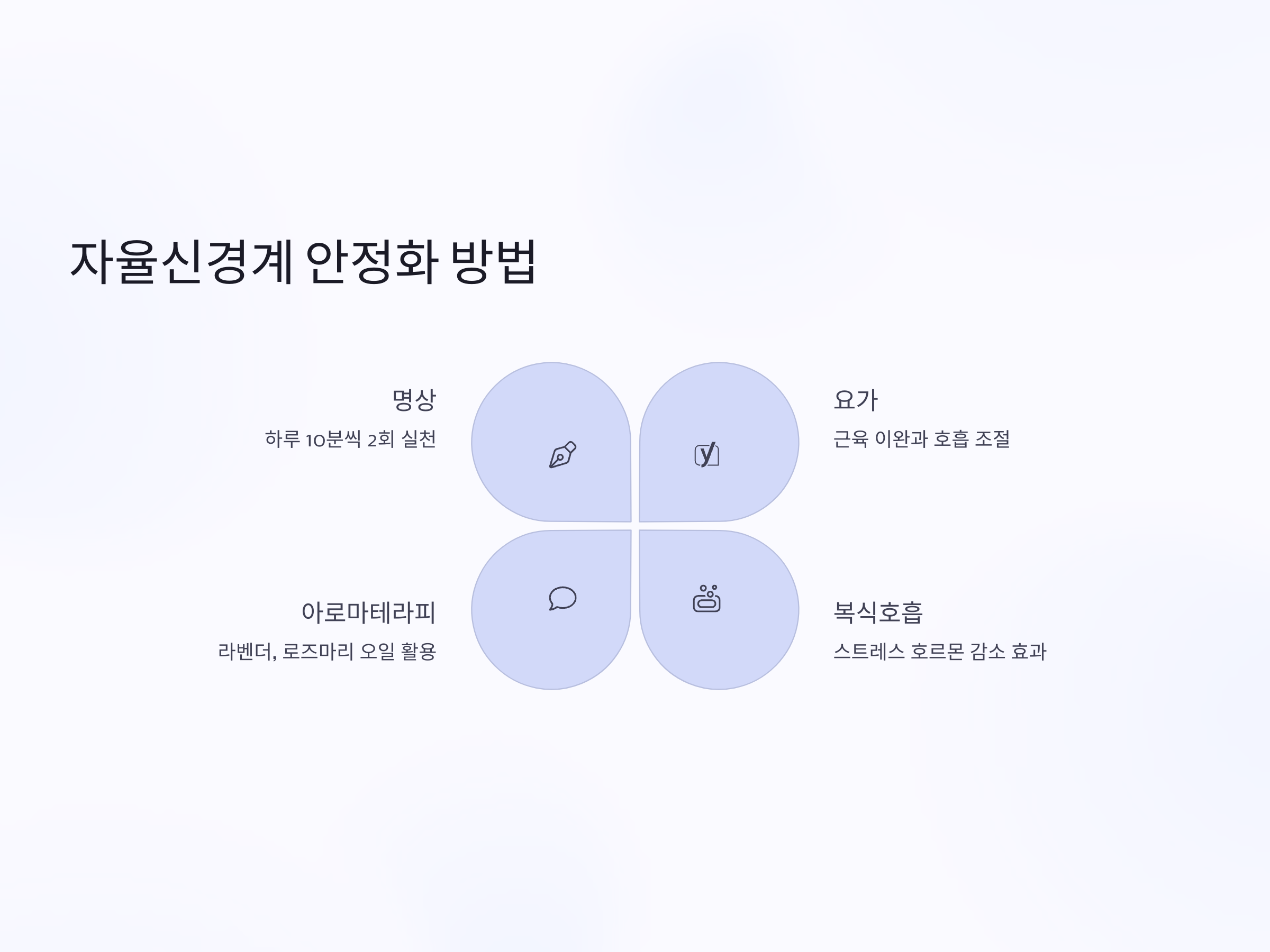 명상, 요가, 복식호흡, 아로마테라피는 자율신경계 안정에 효과적인 방법으로 검증되었으며, 특히 10분의 짧은 명상이라도 하루에 2회 이상 시행하면 신경계 피로를 해소하는 데 도움이 됩니다. 또, 잠자기 1시간 전 스마트폰을 멀리하고, 따뜻한 물로 반신욕을 하는 것도 자율신경계 회복을 촉진합니다.