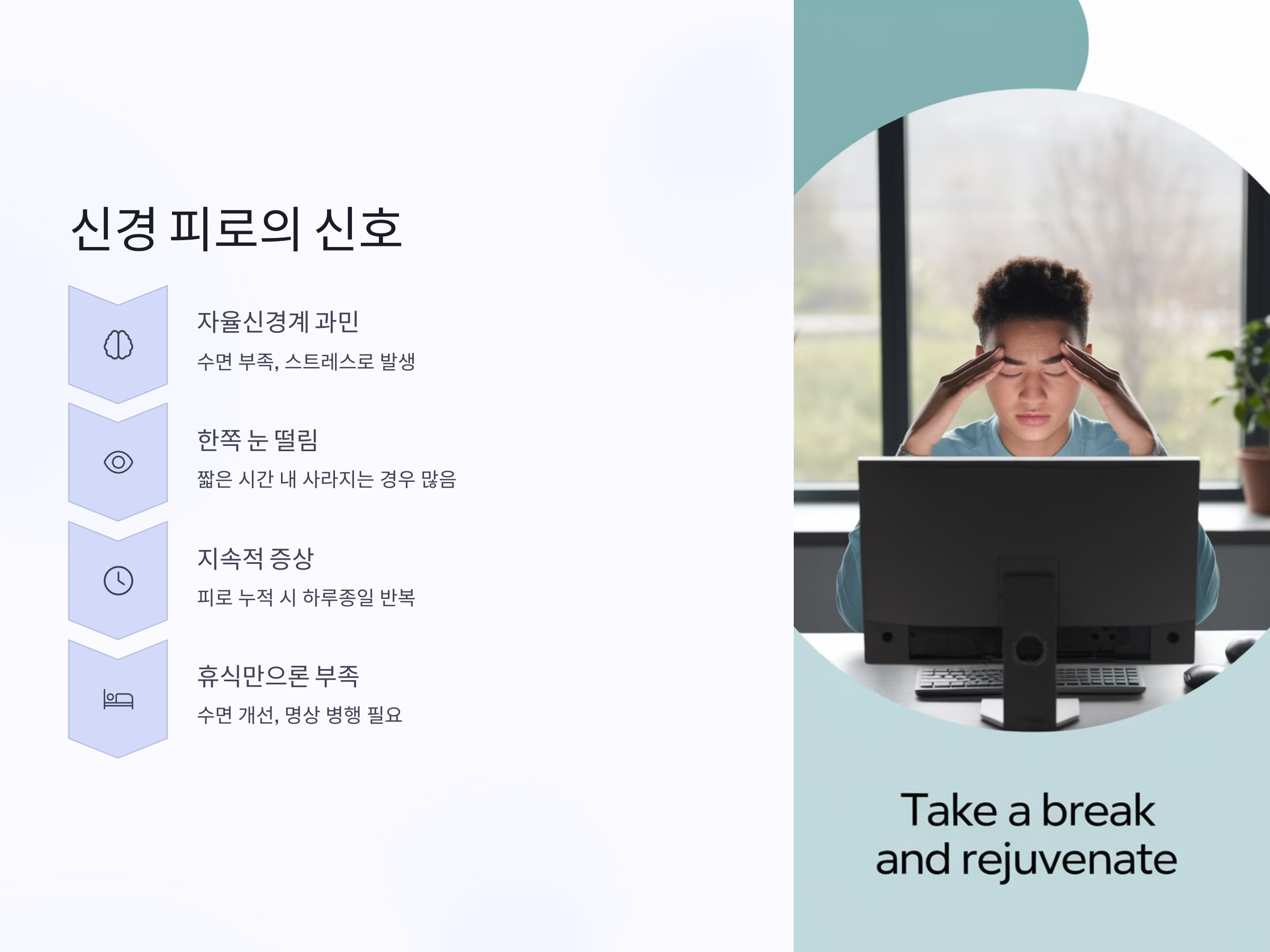 눈꺼풀 떨림은 마그네슘 결핍 외에도 ‘신경 피로’로도 나타날 수 있습니다. 특히 수면 부족, 스트레스, 과로 등이 쌓이면 뇌의 자율신경계가 과민 반응을 일으켜 근육의 떨림 증상이 나타납니다. 신경 피로는 단순히 ‘피곤하다’는 수준을 넘어, 집중력 저하, 감정 기복, 두통 등 다양한 신경 증상과 함께 나타나는 경우가 많아 초기에 체크하는 것이 중요합니다.