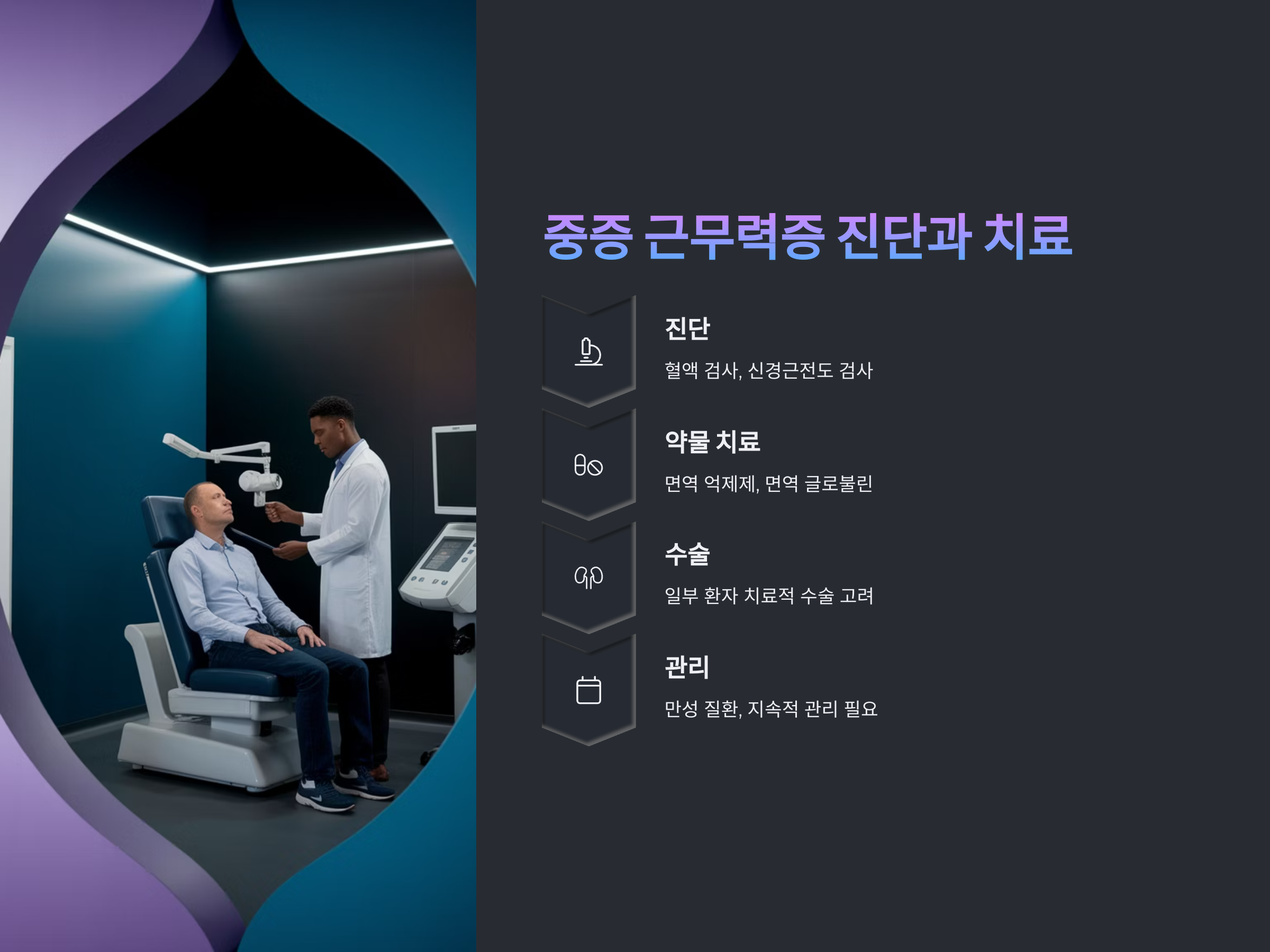 치료는 면역 억제제나 면역 글로불린을 통해 면역 체계를 조절하는 방법이 있습니다. 또한, 일부 환자는 치료적 수술을 고려할 수도 있습니다. 약물 치료와 생활 습관 개선을 통해 증상을 완화할 수 있지만, 중증 근무력증은 완치가 어려운 만성 질환입니다.