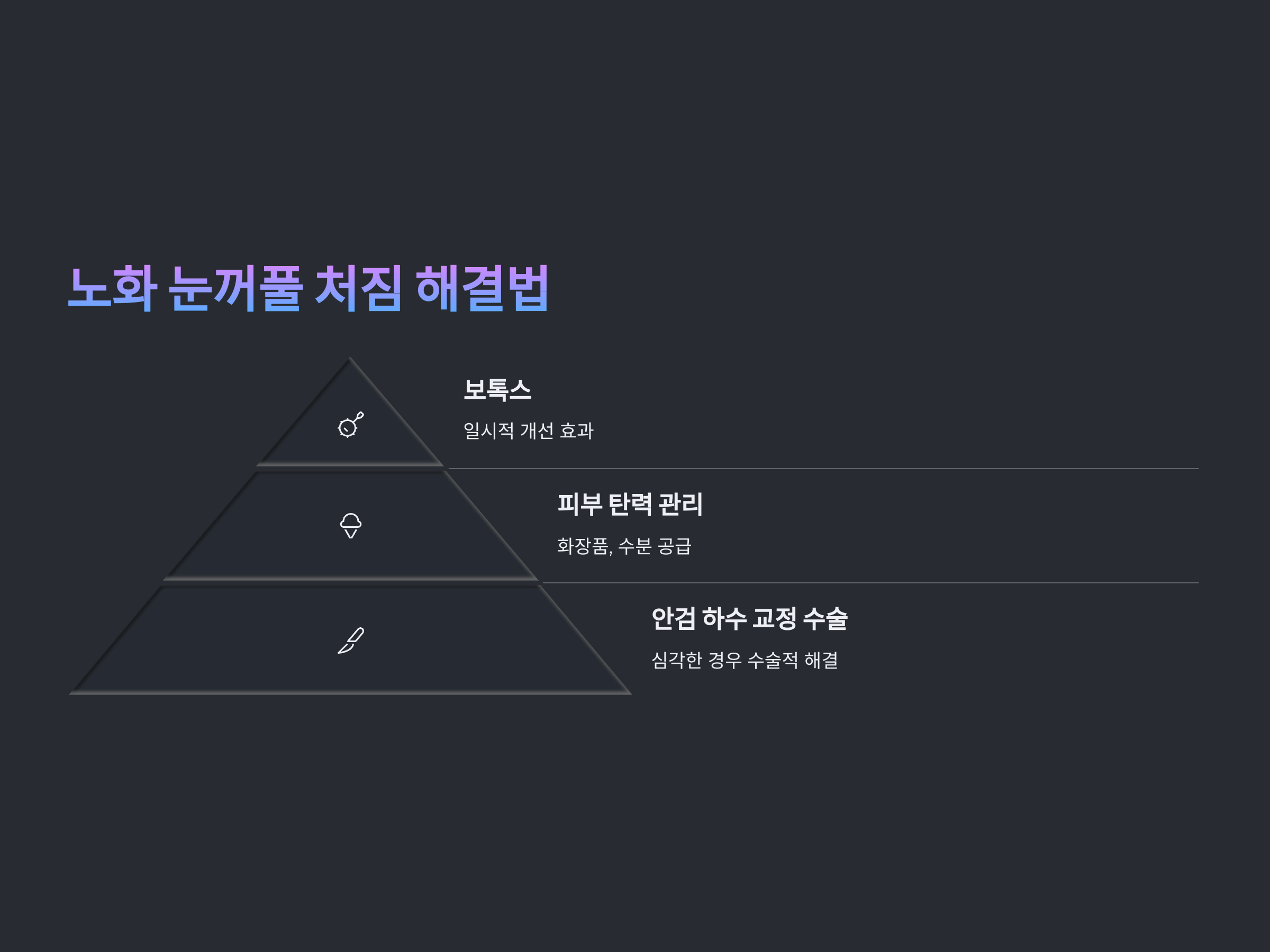- 보톡스: 눈 주위의 근육을 약간 마비시켜 눈꺼풀 처짐을 일시적으로 개선할 수 있습니다.