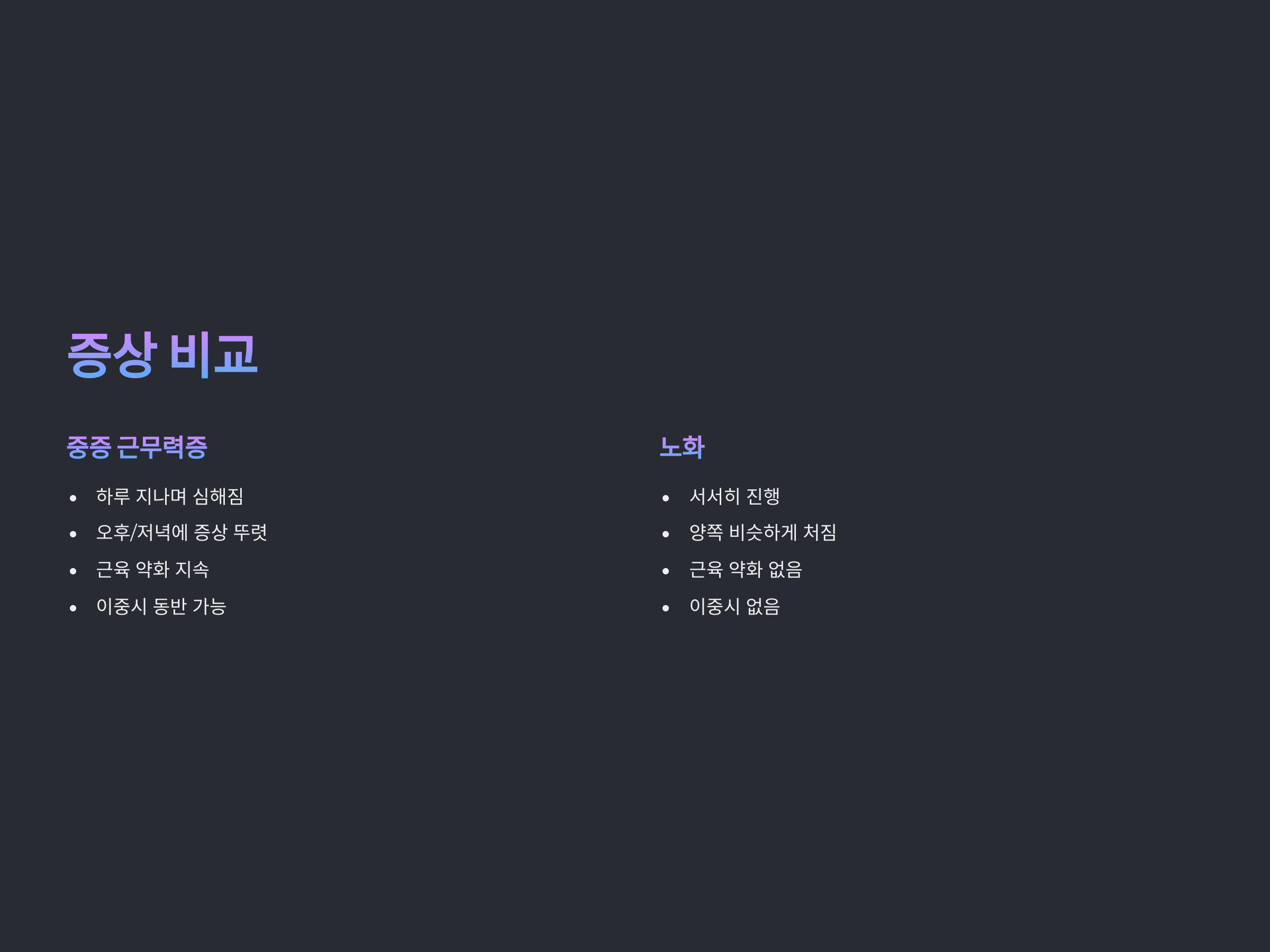 중증 근무력증(Myasthenia Gravis)은 신경과 근육 사이의 신호 전달에 문제가 발생하는 자가면역 질환입니다. 이 질환에서는 면역체계가 잘못 작동하여, 신경과 근육이 제대로 연결되지 않게 됩니다. 이로 인해 근육이 제대로 기능하지 못하고, 피로감이나 근육 약화가 나타날 수 있습니다.