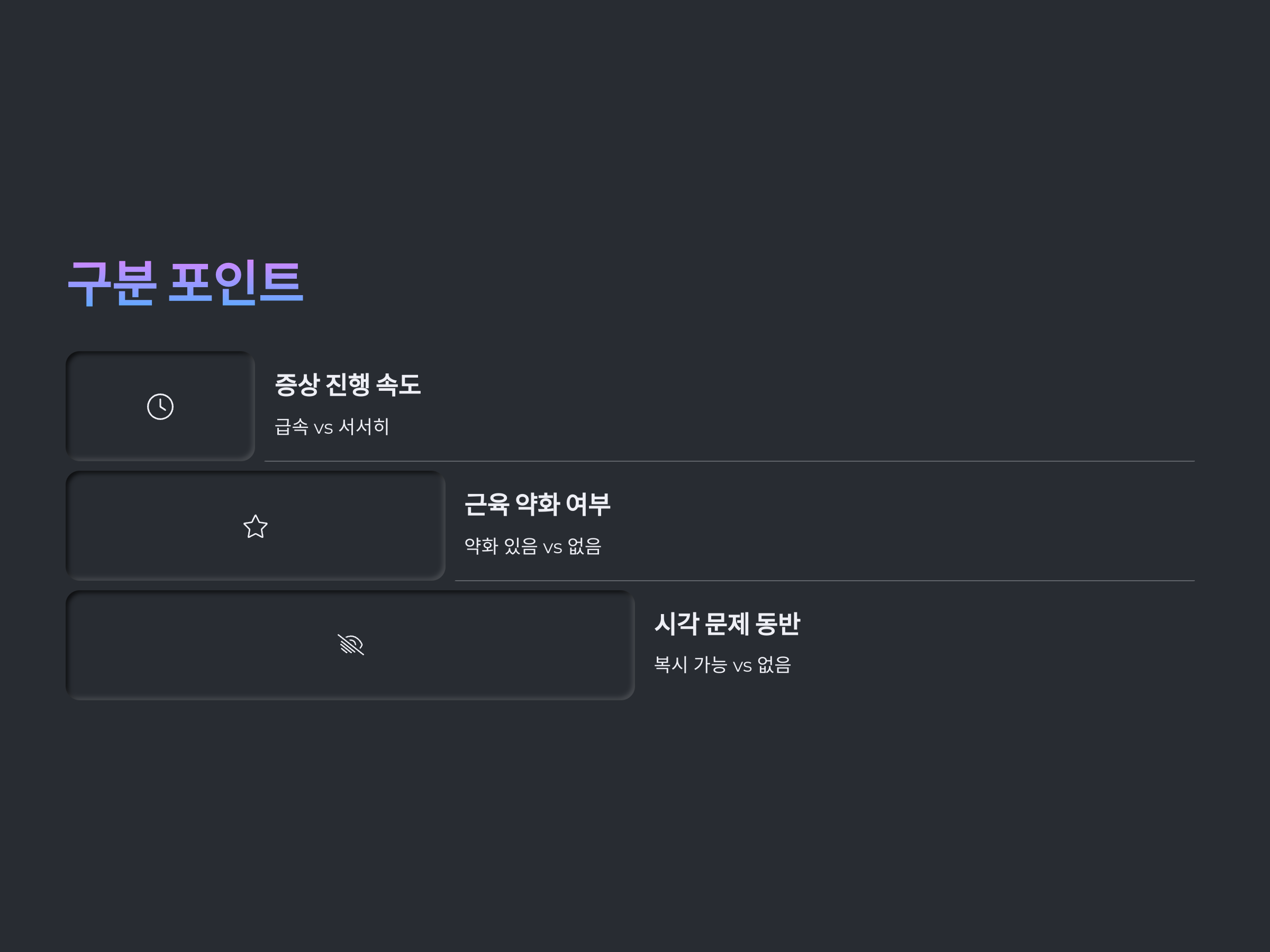 눈꺼풀이 저절로 처지고 피곤함을 느끼는 증상은 많은 사람들에게 나타날 수 있는 문제입니다. 그러나 중증 근무력증과 노화는 그 원인과 증상에서 차이가 있으며, 이를 구분하는 것이 중요합니다. 중증 근무력증은 근육 약화와 피로가 누적되면서 점진적으로 증상이 악화되는 특징이 있으며, 이중시나 복시와 같은 시각적 문제가 동반될 수 있습니다. 반면, 노화에 의한 눈꺼풀 처짐은 천천히 나타나며, 피로와는 크게 연관되지 않습니다.