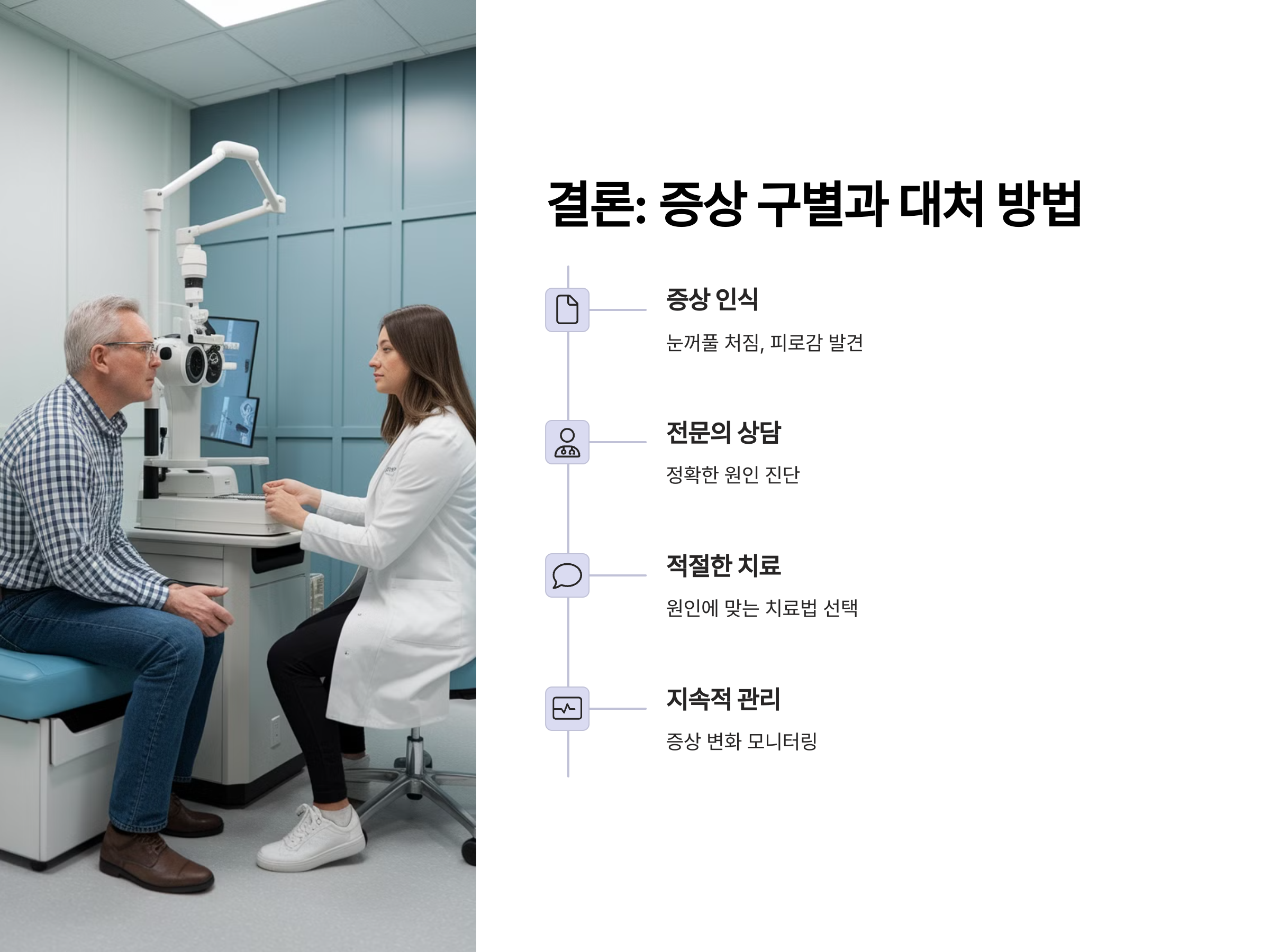 - 눈꺼풀 처짐: 가장 흔한 증상으로, 눈꺼풀이 처져서 시야가 가려집니다.
