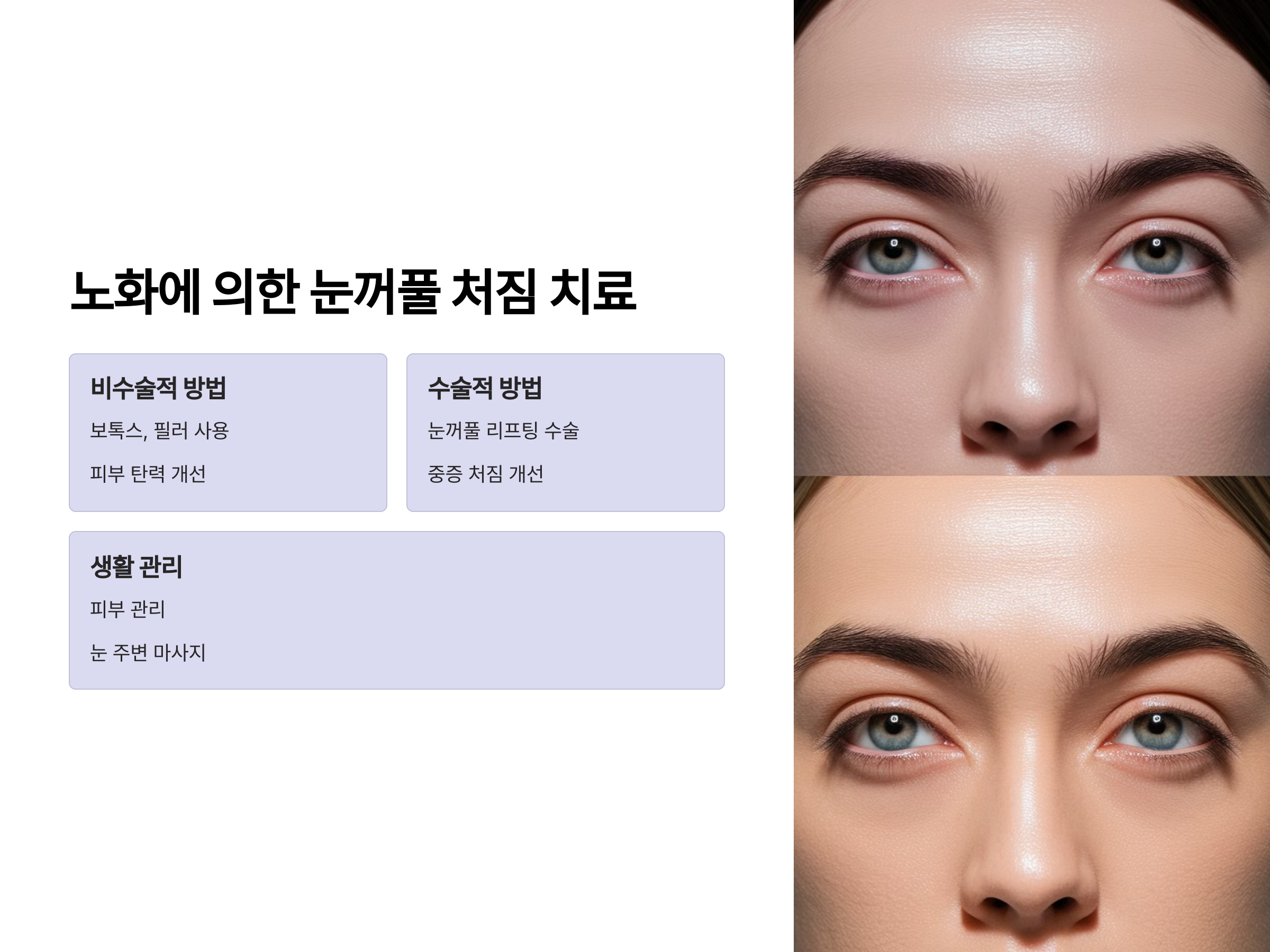 노화로 인한 눈꺼풀 처짐은 미용적인 문제일 수 있지만, 치료를 통해 증상을 개선할 수 있습니다. 주로 눈꺼풀 리프팅 수술이나 비수술적인 방법이 사용됩니다. 또한, 피부 탄력을 유지하는 데 도움이 되는 미용 치료도 고려할 수 있습니다.