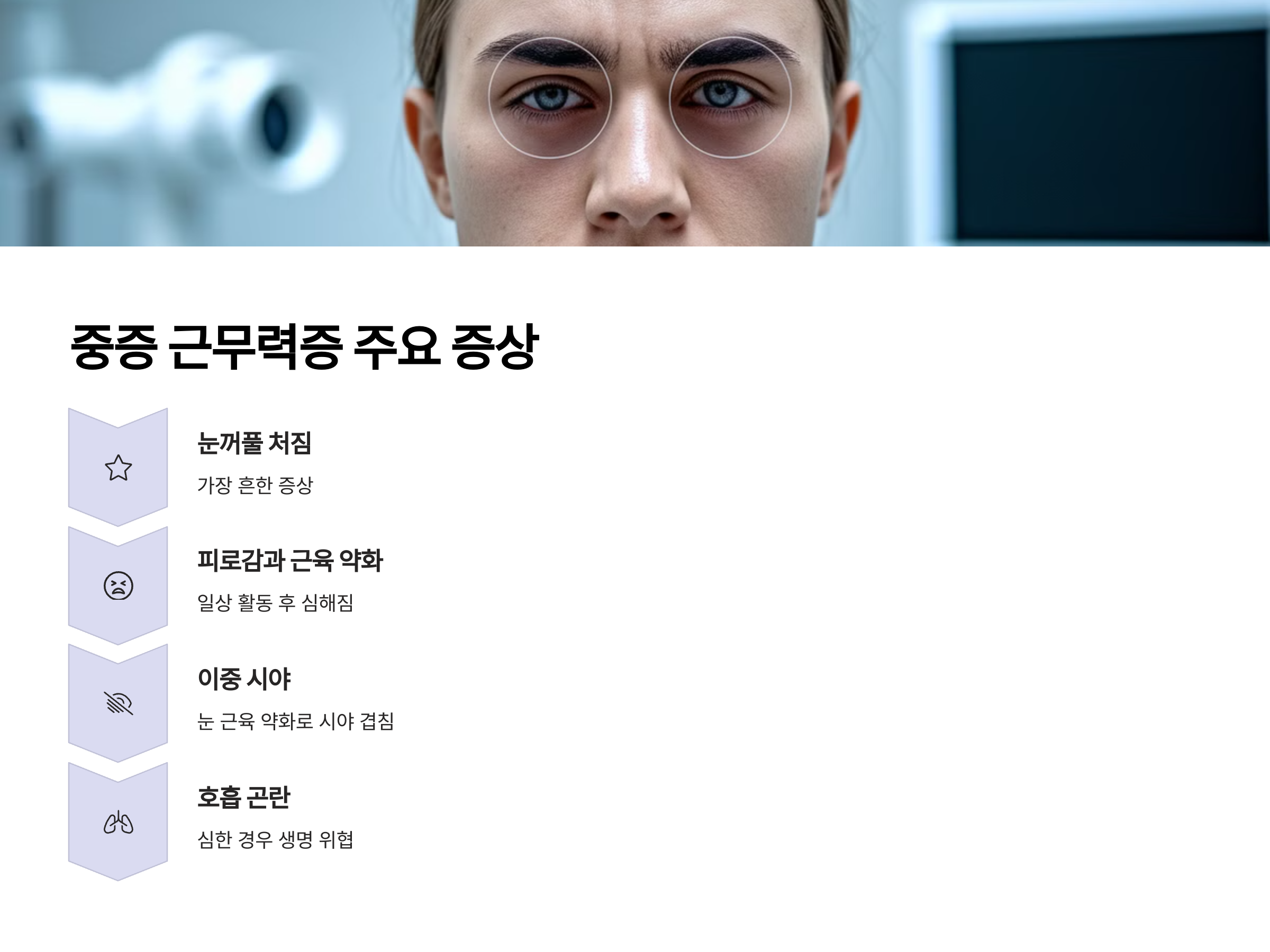 - 중증 근무력증: 증상이 빠르게 진행될 수 있습니다. 초기에는 눈꺼풀 처짐이나 피로감이 느껴지지만, 시간이 지나면서 다른 근육에도 영향을 미쳐 증상이 악화될 수 있습니다.