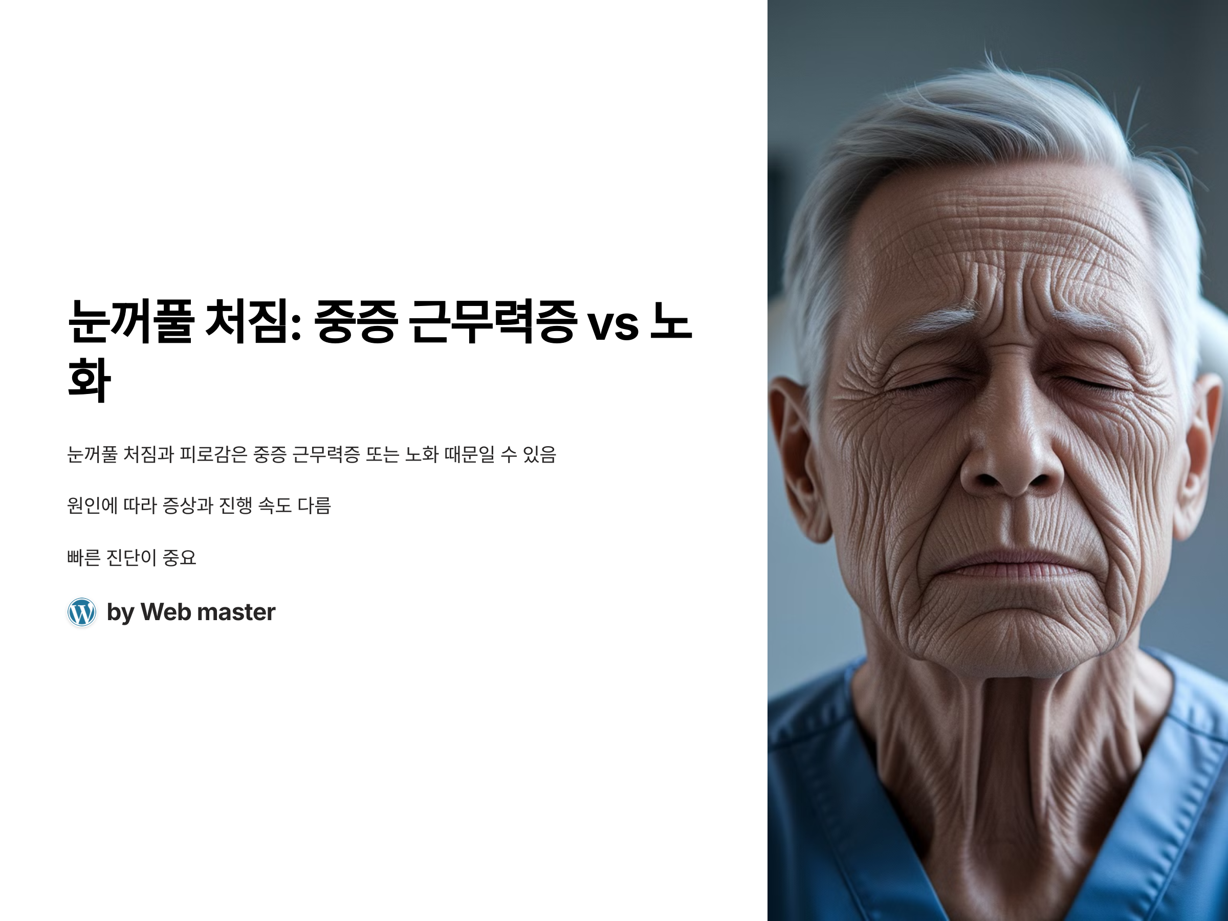 눈꺼풀 처짐과 피로감이 있다면, 중증 근무력증과 노화로 인한 변화를 구별하는 것이 중요합니다. 중증 근무력증은 빠르게 진행될 수 있으며, 다른 신체 부위의 근육에도 영향을 미칠 수 있기 때문에 신속한 진단과 치료가 필요합니다. 반면, 노화에 의한 변화는 점진적으로 나타나며, 일상생활에 큰 영향을 미치지 않는 경우가 많습니다. 증상이 지속되거나 악화된다면, 반드시 전문의를 찾아 진단을 받는 것이 좋습니다.