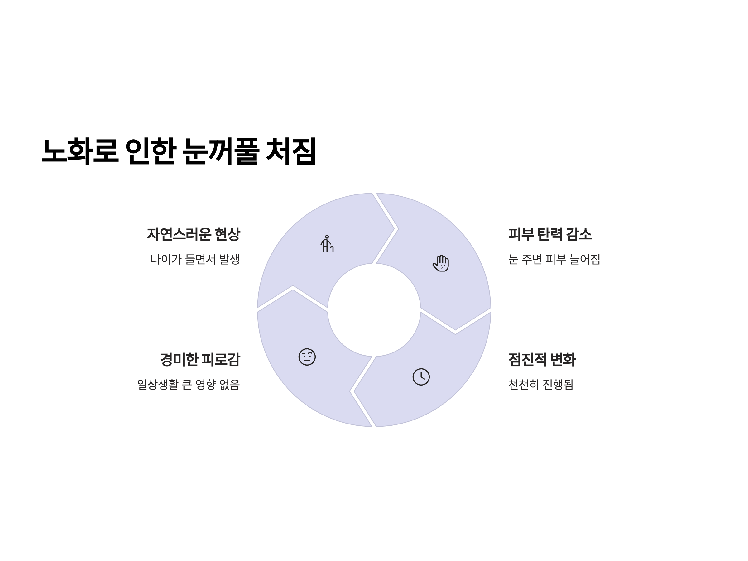 - 노화로 인한 변화: 눈꺼풀 처짐 이외에는 특별한 다른 증상이 동반되지 않습니다.