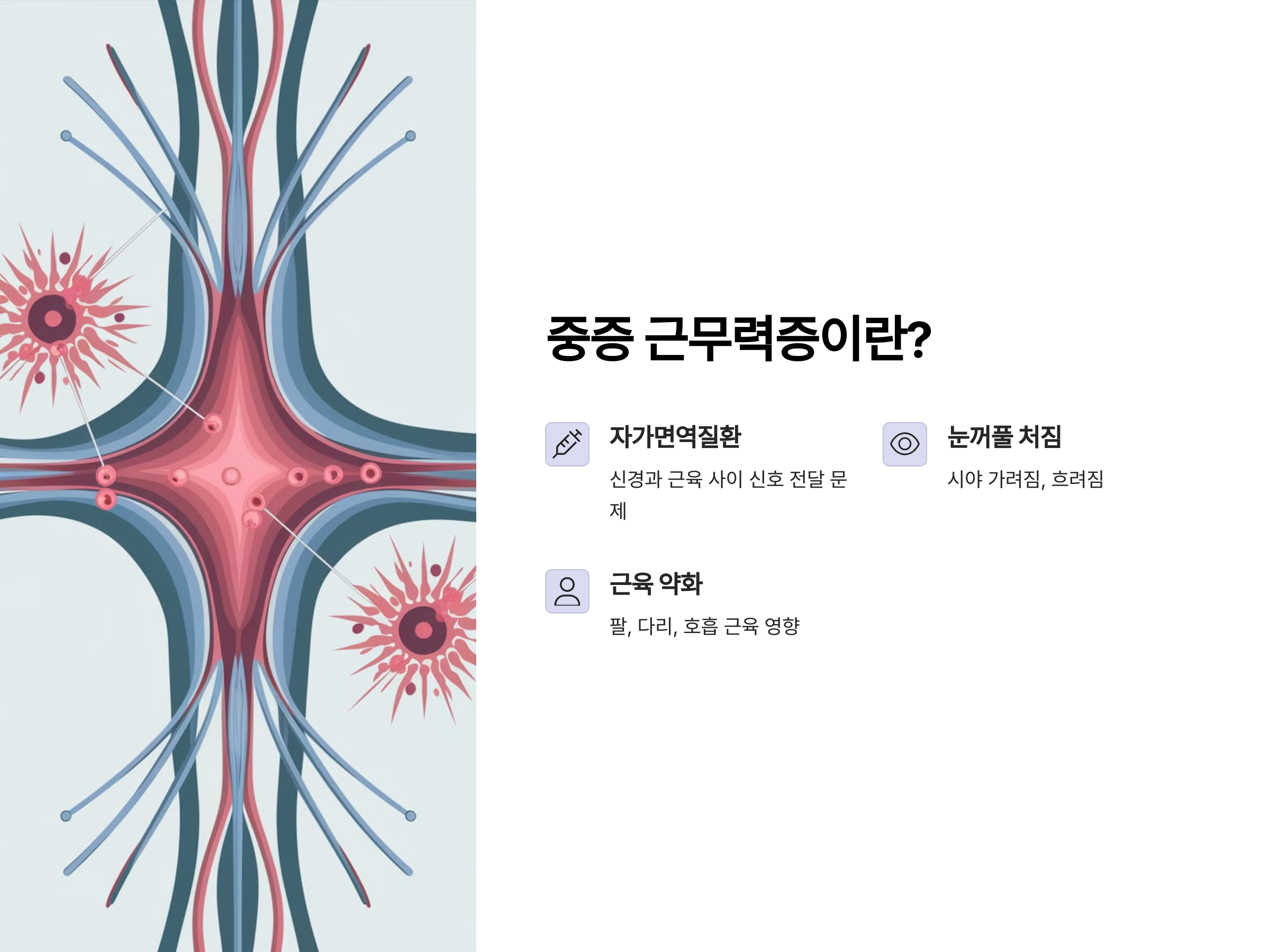 중증 근무력증(Myasthenia Gravis)은 자가 면역질환 중 하나로, 신경과 근육 사이의 신호 전달에 문제가 발생하여 근육이 제대로 수축되지 못하는 질환입니다. 가장 큰 특징은 근육이 피로해지고, 쉽게 약해지는 점입니다. 특히 눈꺼풀이 처지고, 이로 인해 눈이 자주 감기거나 시야가 흐려지는 경우가 많습니다. 이 외에도 팔, 다리, 호흡을 담당하는 근육에도 영향을 미칠 수 있으며, 시간이 지나면서 증상이 점차 악화될 수 있습니다.