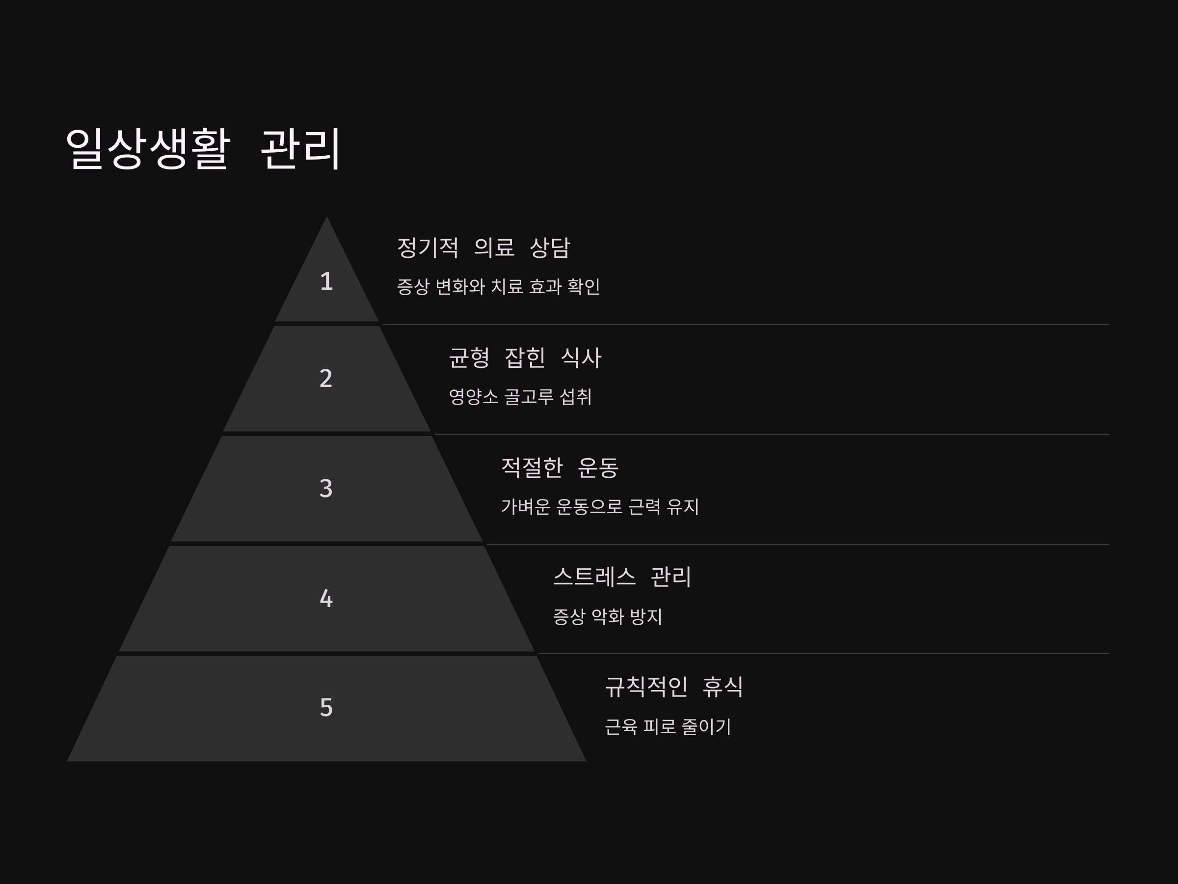 - 적절한 운동: 무리하지 않는 범위 내에서 가벼운 운동을 통해 근력을 유지합니다.