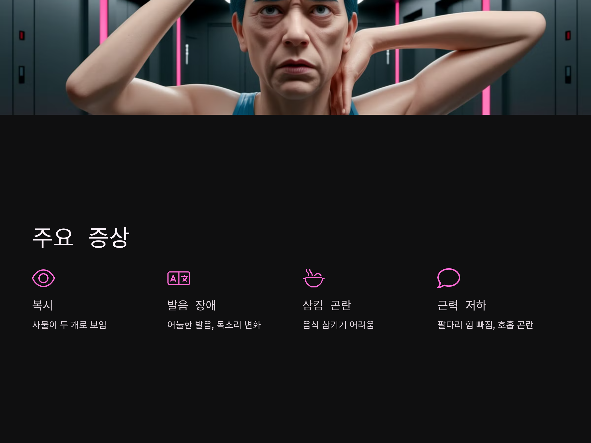 - 호흡 곤란: 심한 경우 호흡 근육의 약화로 인해 호흡이 어려워질 수 있습니다. citeturn0search3