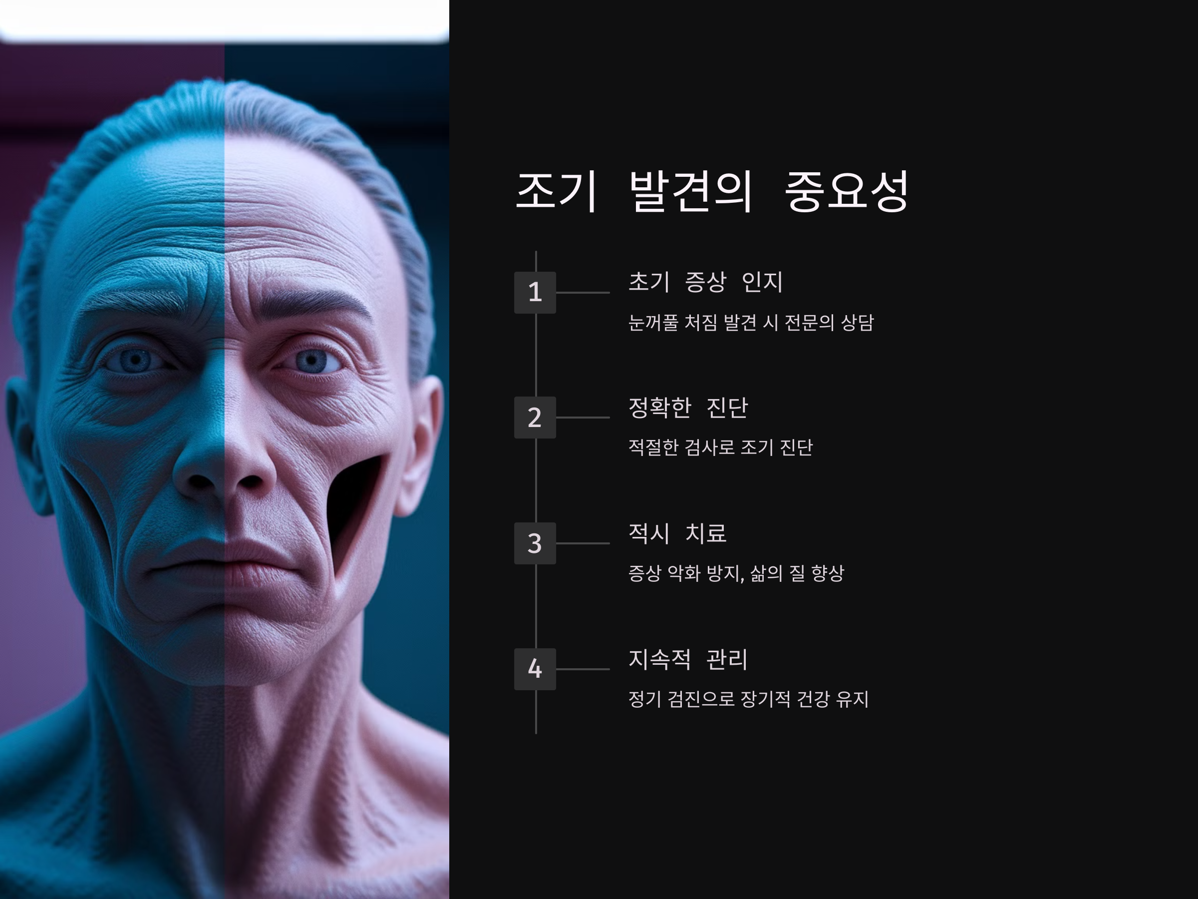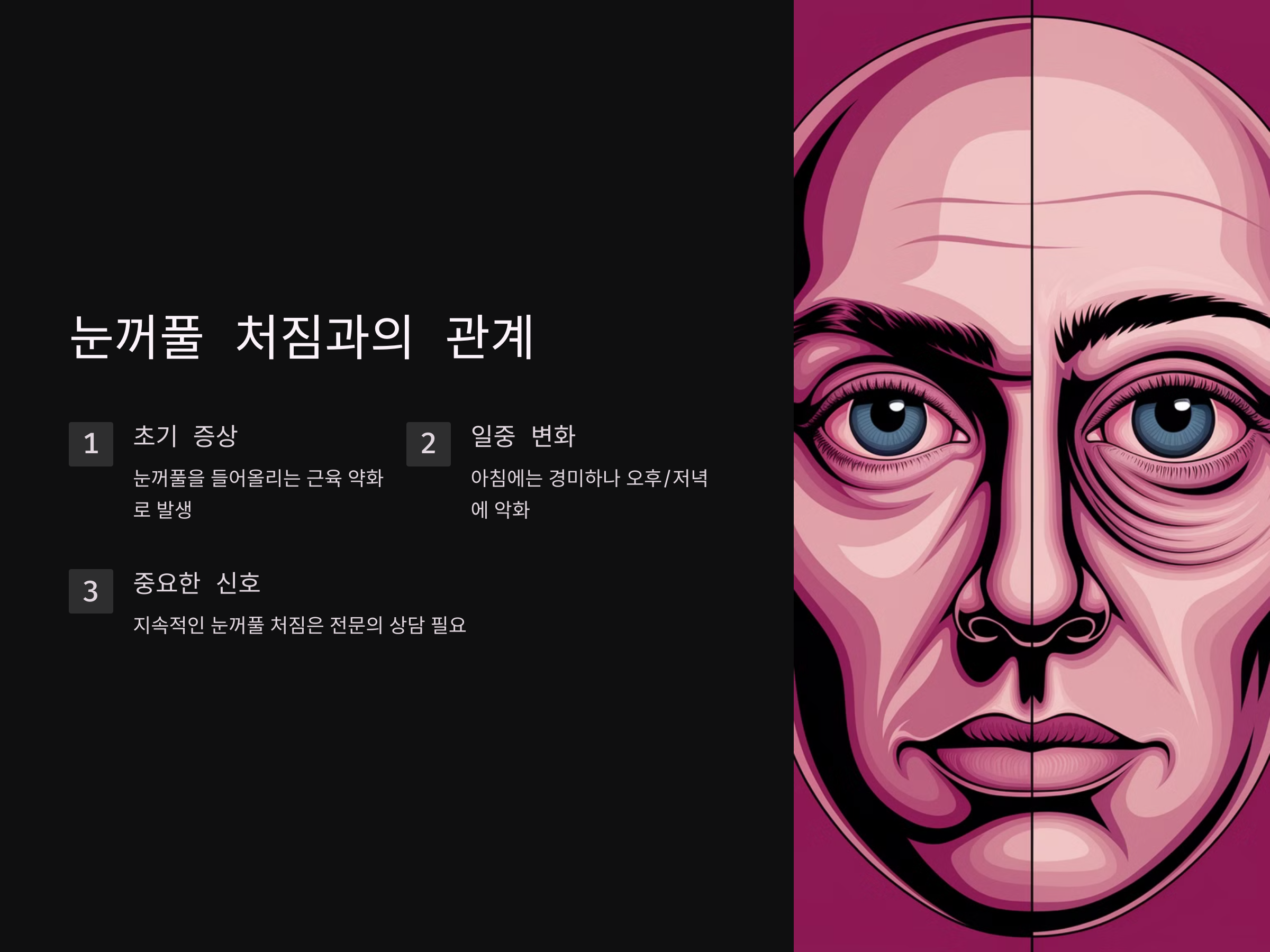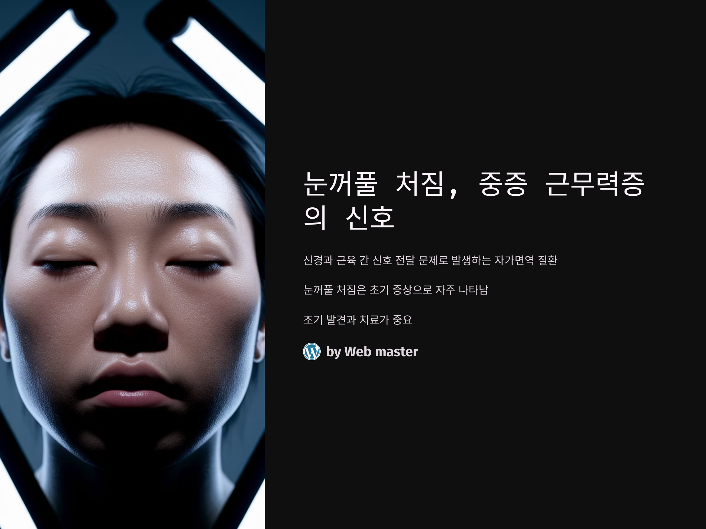 중증 근무력증은 신경과 근육 간의 신호 전달에 문제가 생겨 근육 약화와 피로를 유발하는 자가면역 질환입니다. 특히 눈꺼풀 처짐(안검하수)은 이 질환의 초기 증상으로 자주 나타나며, 이를 간과하면 병이 진행될 수 있습니다. 따라서 이러한 증상이 나타난다면 조기에 전문의와 상담하여 정확한 진단과 치료를 받는 것이 중요합니다. citeturn0search3