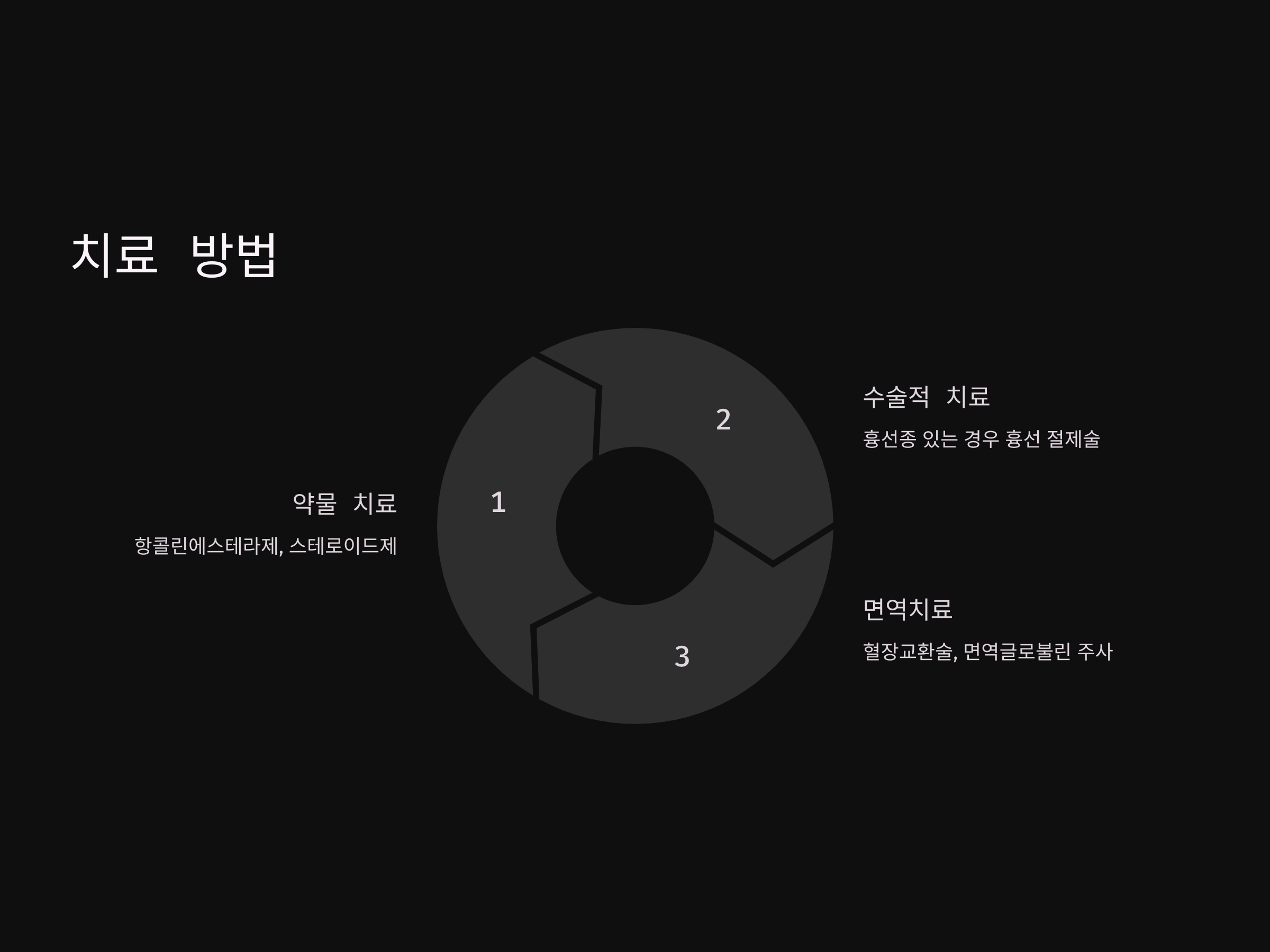 중증 근무력증의 치료는 증상의 정도와 환자의 상태에 따라 다양하게 이루어집니다. 주요 치료 방법으로는 다음과 같습니다: