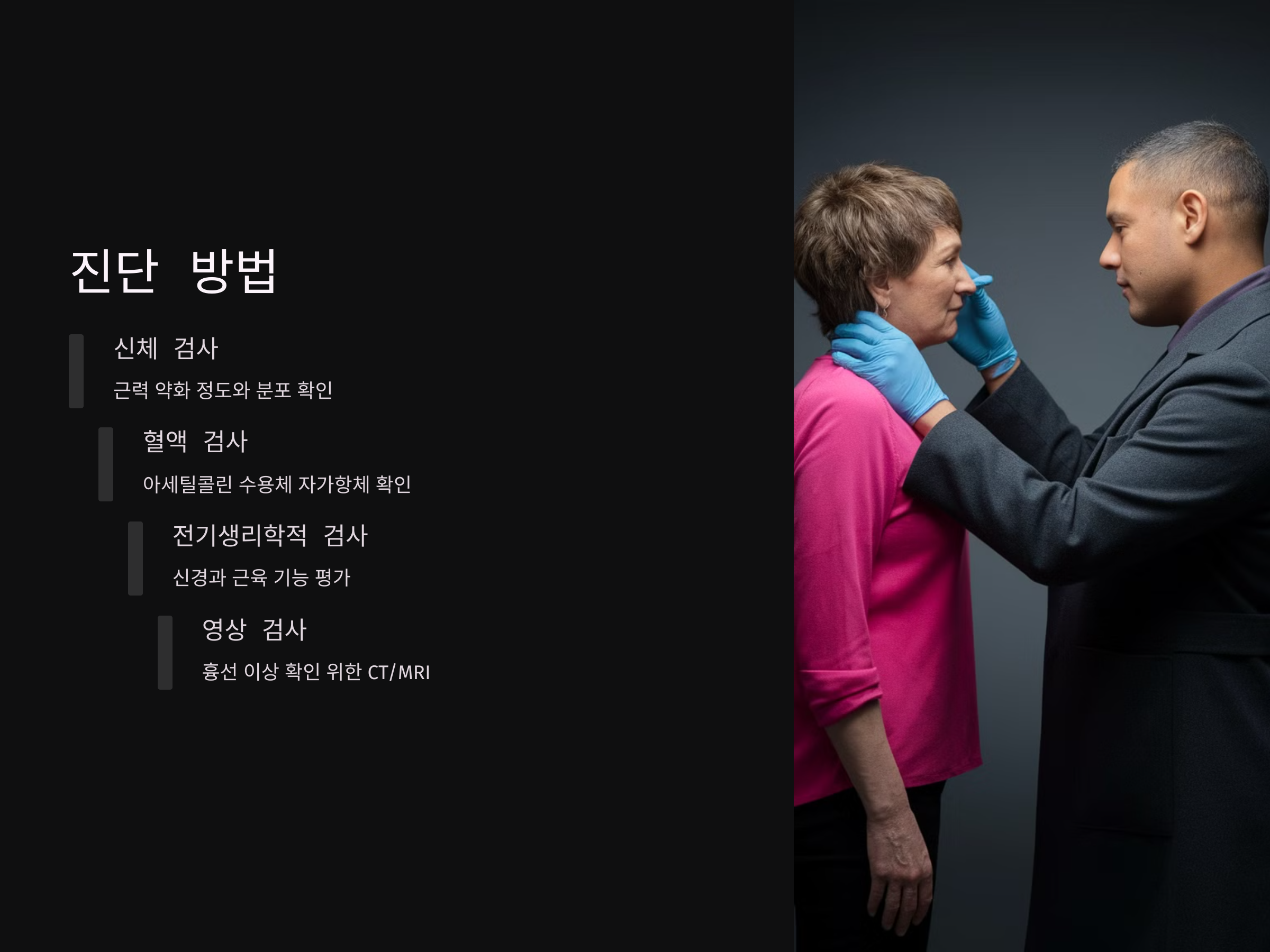 - 혈액 검사: 아세틸콜린 수용체에 대한 자가항체의 존재 여부를 확인합니다.