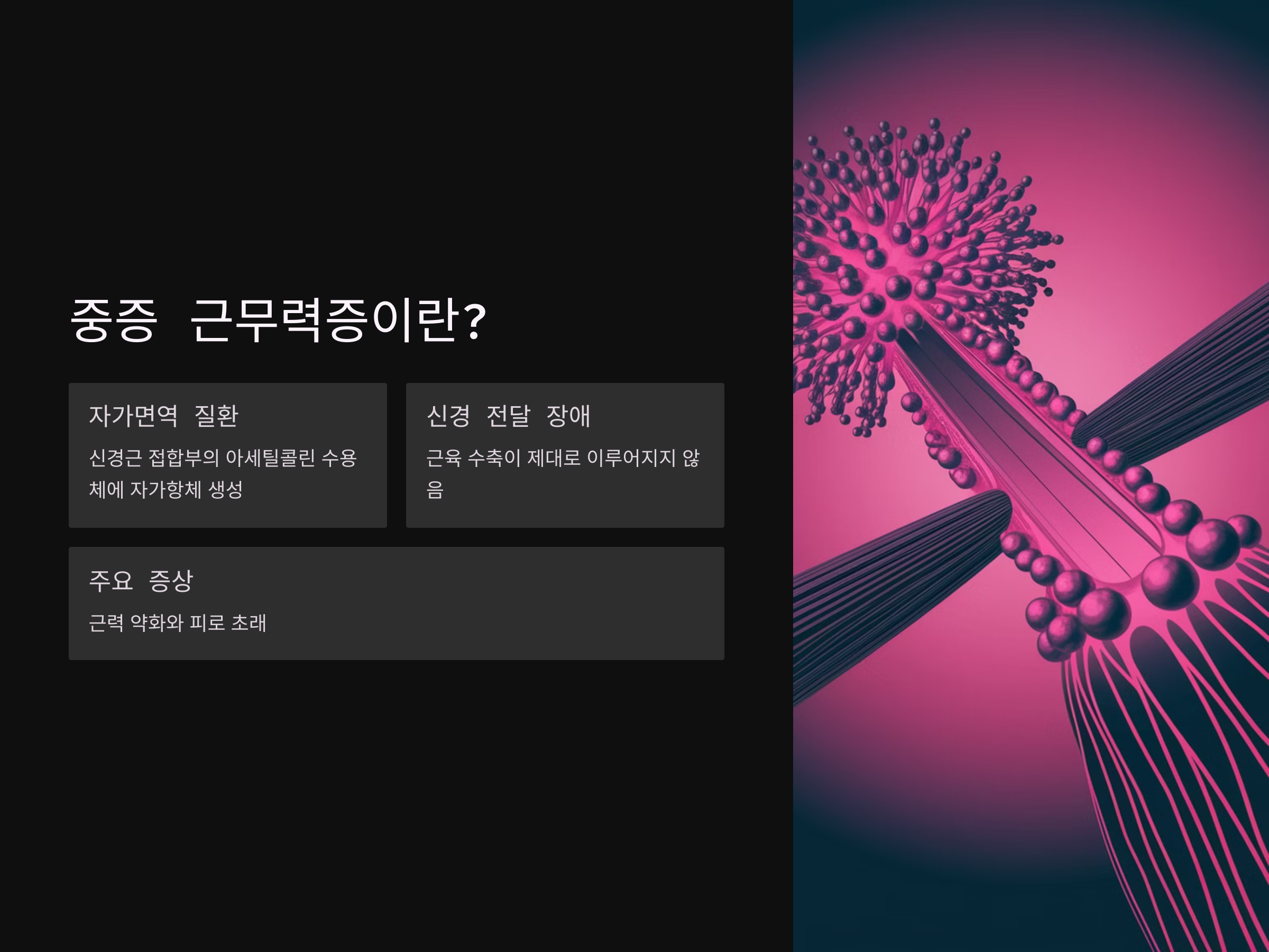 중증 근무력증은 신경과 근육을 연결하는 부위인 신경근 접합부에서 신경전달물질인 아세틸콜린의 수용체에 대한 자가항체가 생성되어 발생하는 자가면역 질환입니다. 이로 인해 근육 수축이 제대로 이루어지지 않아 근력 약화와 피로를 초래합니다. citeturn0search6