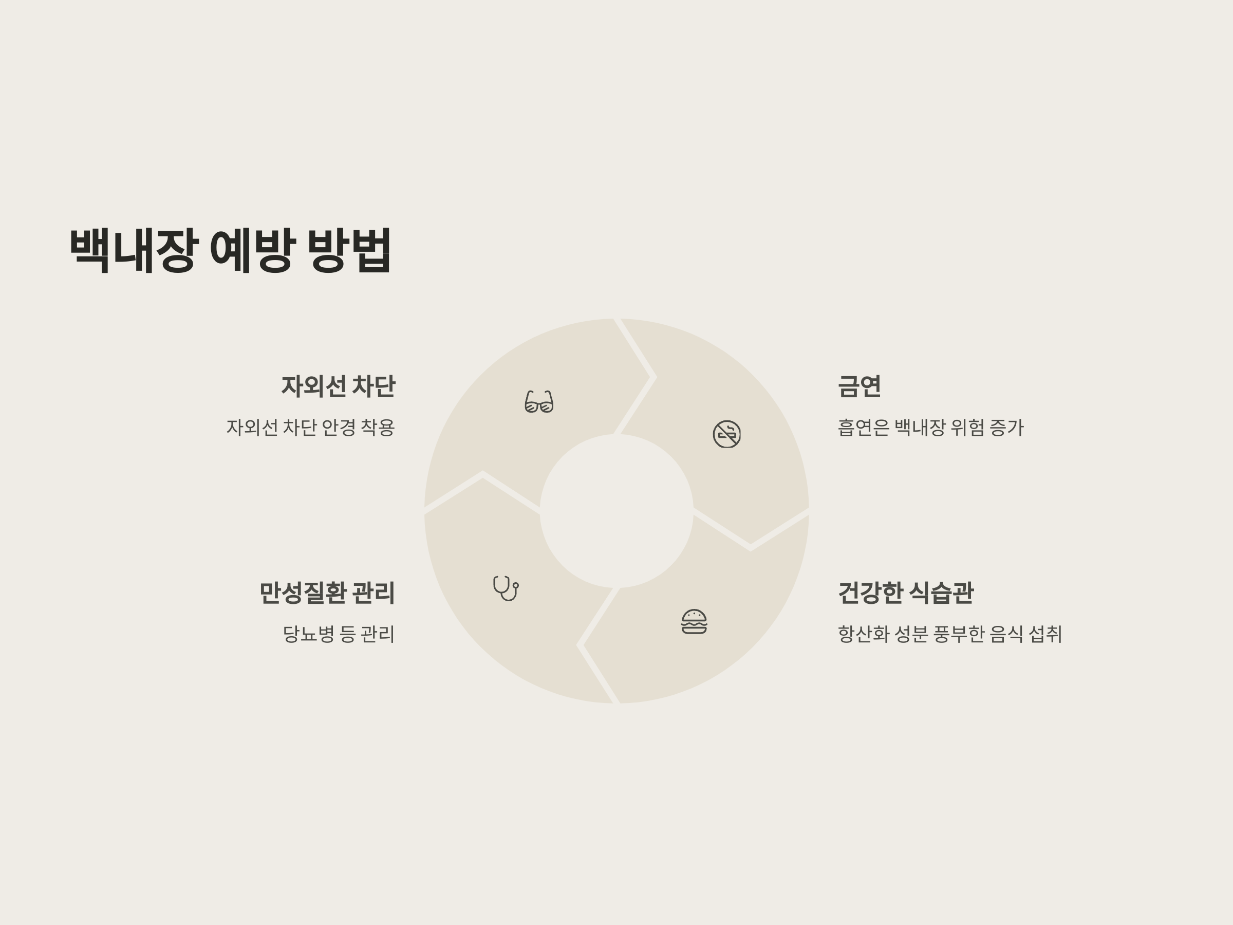백내장은 나이가 들면서 자연스럽게 발생할 수 있지만, 몇 가지 예방 방법을 통해 그 발생을 늦출 수 있습니다. 가장 중요한 예방 방법은 자외선 차단입니다. 자외선은 백내장의 주요 원인 중 하나이므로, 자외선 차단 안경을 착용하는 것이 매우 중요합니다.