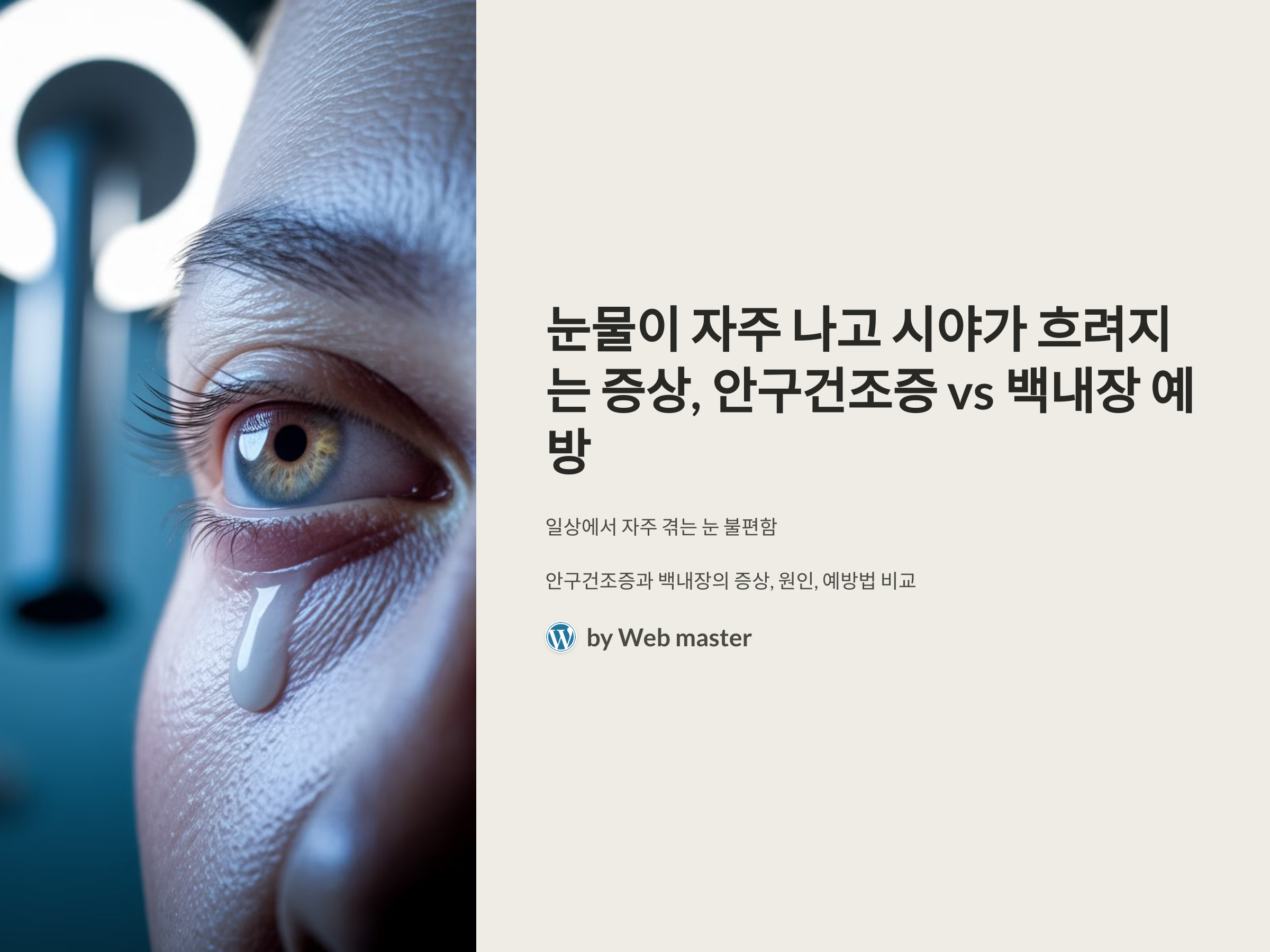 눈물이 자주 나고 시야가 흐려지는 증상은 우리가 일상에서 자주 겪을 수 있는 불편한 상황입니다. 이러한 증상은 안구건조증이나 백내장 등 다양한 눈 질환에서 발생할 수 있습니다. 각각의 질환은 증상은 비슷해 보일 수 있지만, 원인과 예방 방법에서 큰 차이를 보입니다. 이번 글에서는 안구건조증과 백내장의 주요 증상, 원인, 그리고 예방 방법을 비교하여 알아보겠습니다.