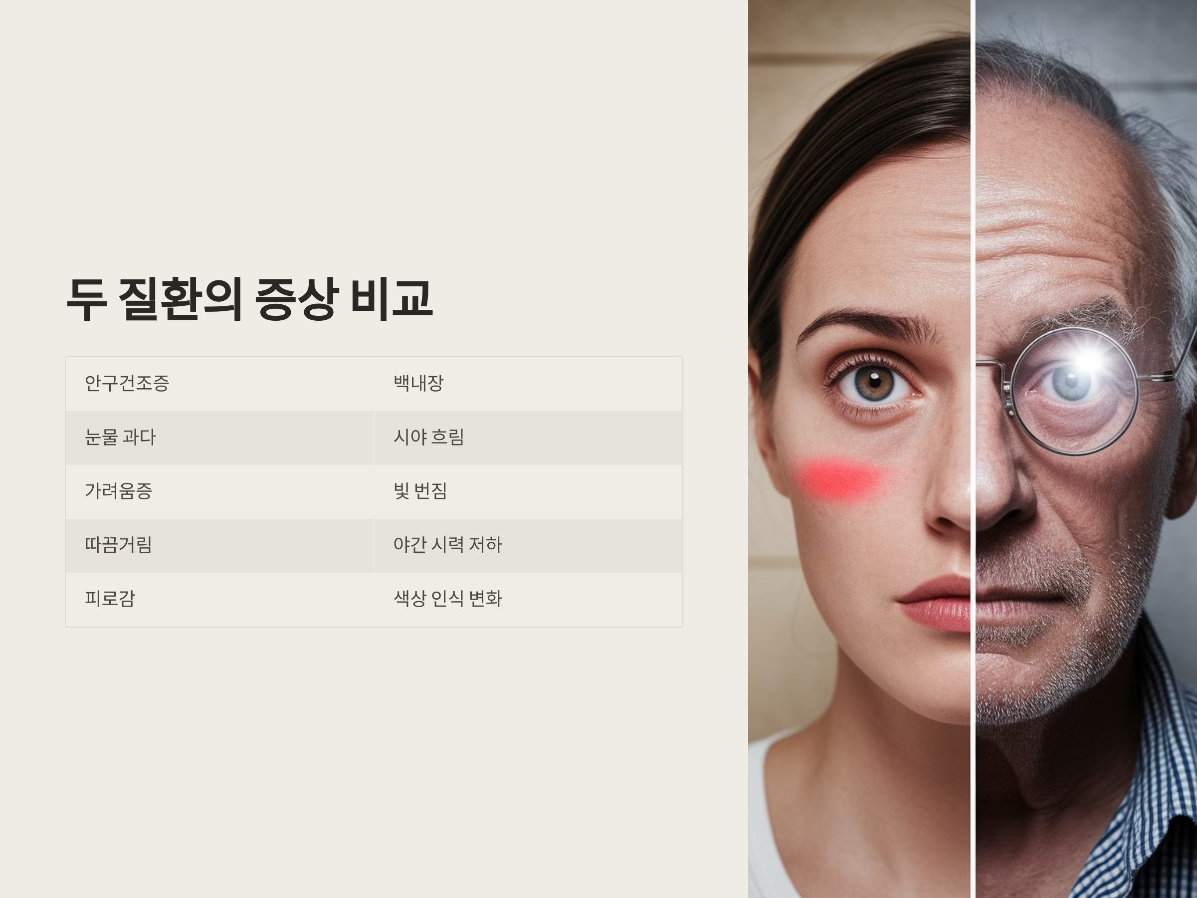 눈물이 자주 나고 시야가 흐려지는 증상은 안구건조증과 백내장 모두에서 나타날 수 있지만, 두 질환의 증상에는 차이가 있습니다. 안구건조증에서는 눈물이 자주 나고, 시야가 흐려지며, 눈의 가려움증이나 따끔거림이 동반될 수 있습니다. 반면, 백내장에서는 시야가 흐려지고 물체의 윤곽이 명확하지 않으며, 빛 번짐 현상이나 야간 시력 저하가 더 두드러지게 나타납니다.