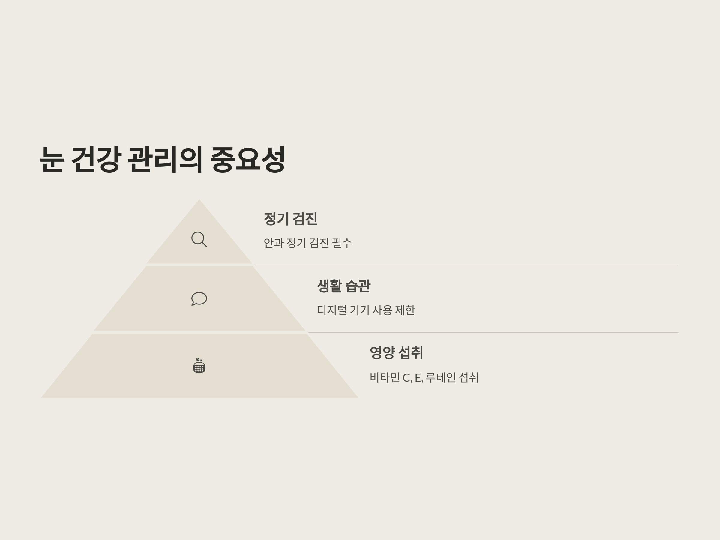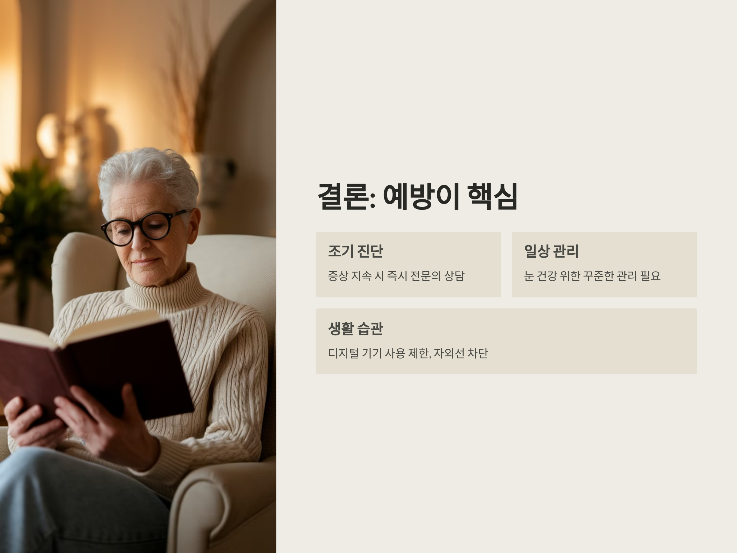 눈 건강을 유지하기 위해서는 꾸준한 관리와 정기적인 안과 검진이 필요합니다. 만약 눈에 이상 증상이 지속된다면 즉시 전문의에게 상담을 받는 것이 바람직합니다.