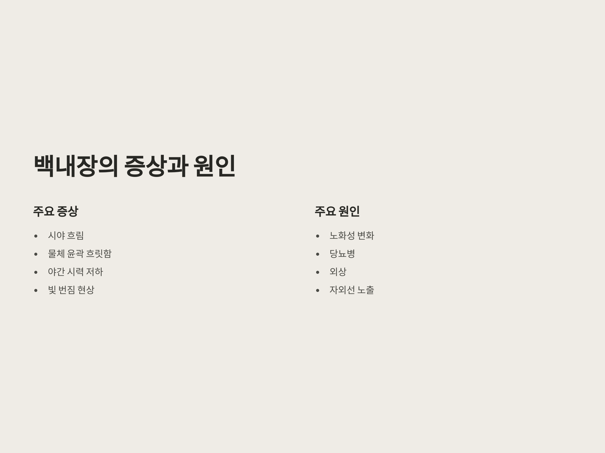 백내장은 안구의 수정체가 혼탁해져서 시야가 흐려지는 질환입니다. 이로 인해 시력이 점차 저하되며, 물체의 윤곽이 흐릿하게 보이거나 야간 시력이 저하되는 증상이 나타날 수 있습니다. 백내장이 진행됨에 따라 시야가 흐려지고, 빛 번짐 현상이나 눈부심도 나타날 수 있습니다. 초기에는 별다른 통증 없이 서서히 진행되므로 자각하기 어려운 경우가 많습니다.