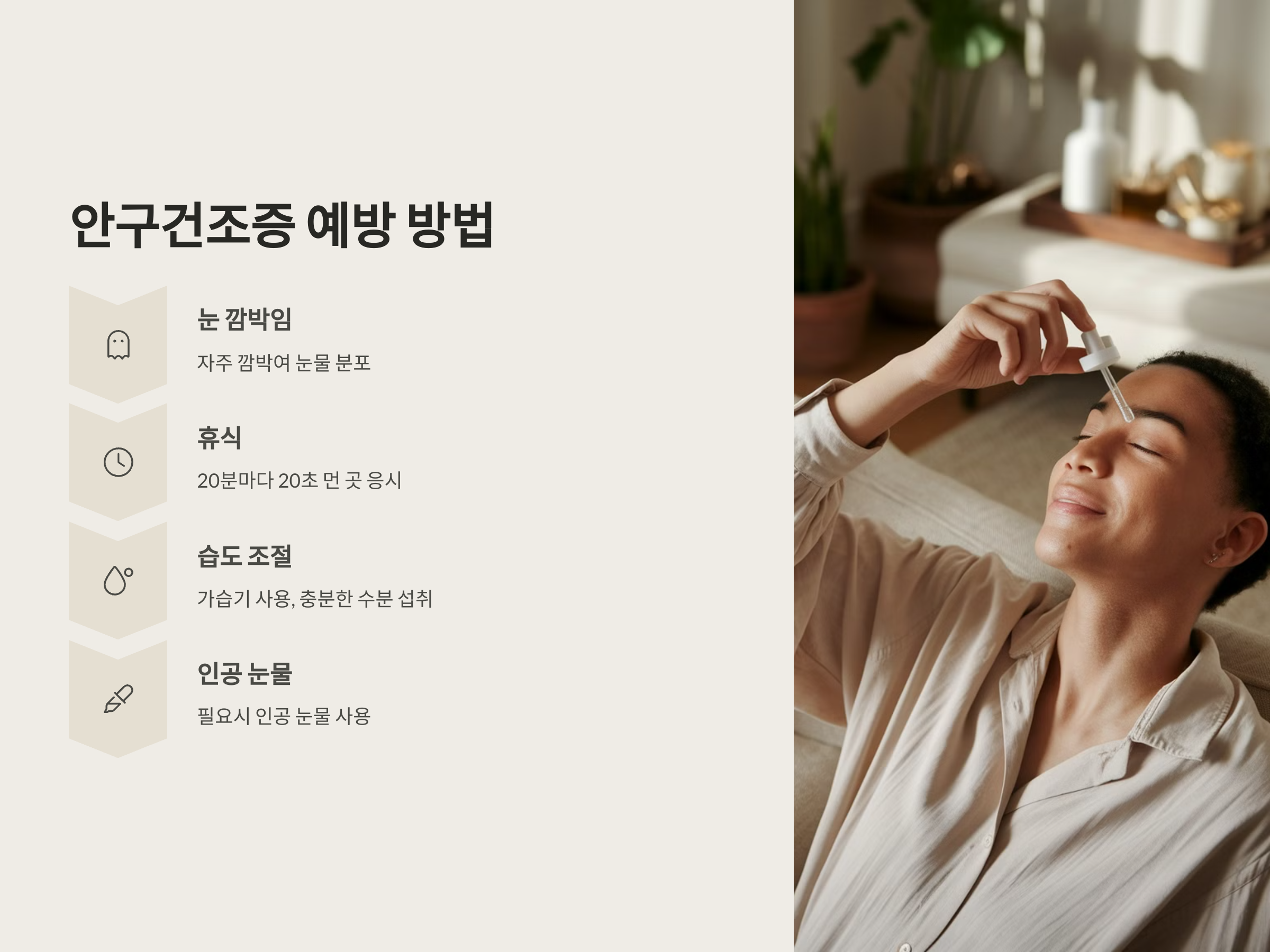 안구건조증은 예방과 관리가 가능합니다. 첫 번째로, 눈을 자주 깜박여 눈물을 고르게 분포시켜주는 것이 중요합니다. 디지털 기기를 사용할 때는 20분마다 20초씩 먼 곳을 바라보며 눈을 쉬게 해주는 것이 좋습니다. 또한, 건조한 환경에서는 가습기를 사용하여 실내 습도를 조절하고, 수분 섭취를 충분히 하는 것이 도움이 됩니다.