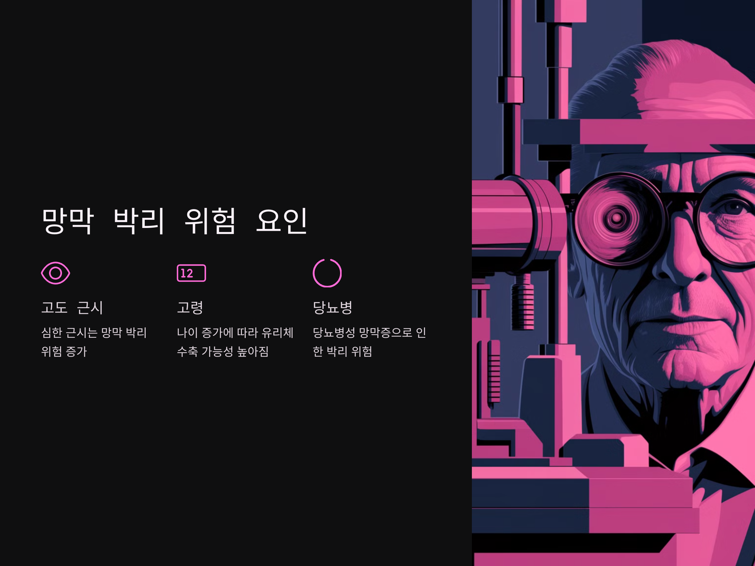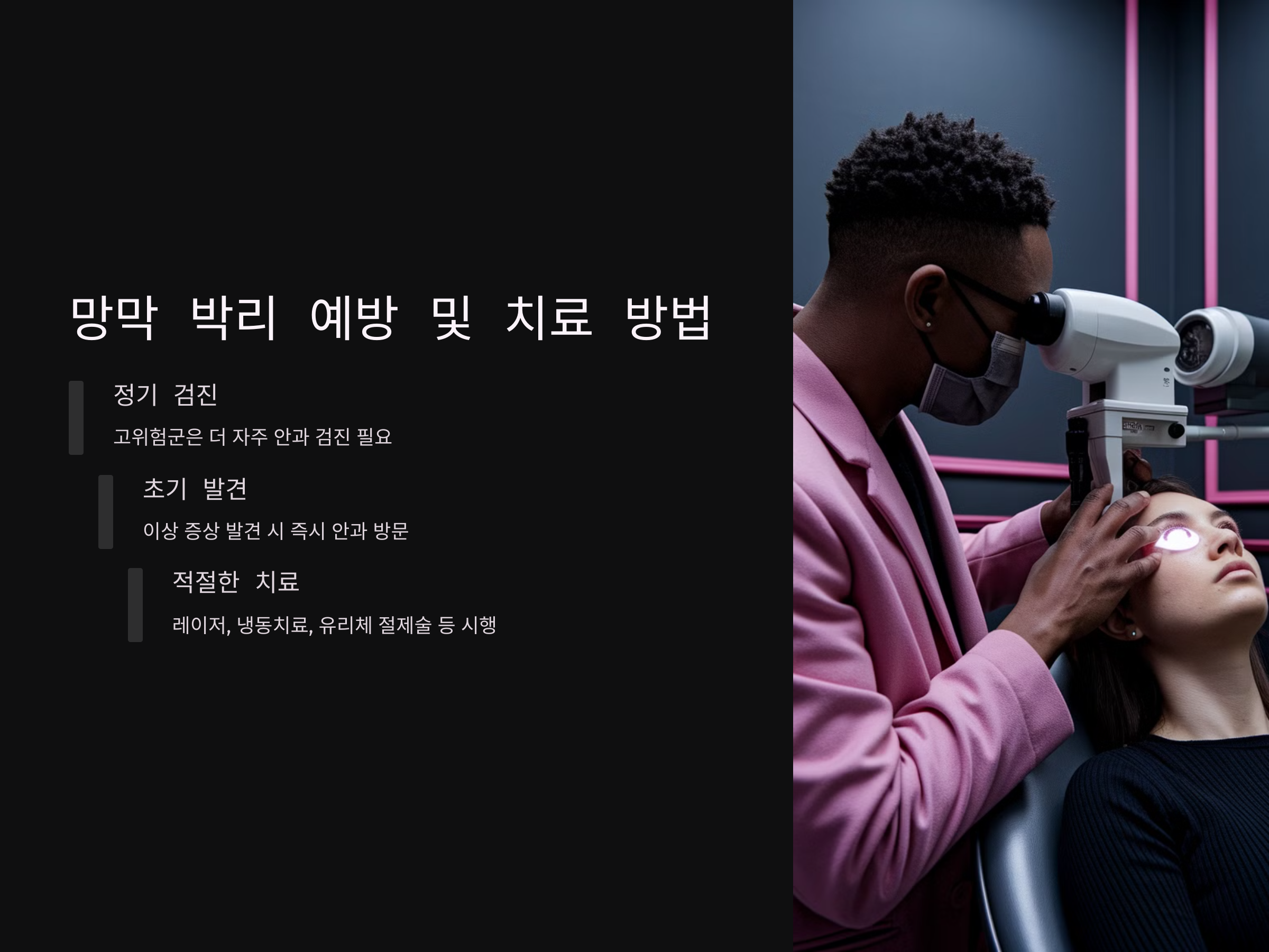 망막 박리를 예방하기 위한 특별한 방법은 없지만, 정기적인 안과 검진을 통해 망막의 상태를 확인하는 것이 중요합니다. 특히, 고위험군인 고도 근시나 당뇨병이 있는 사람들은 더 자주 검진을 받아야 합니다.