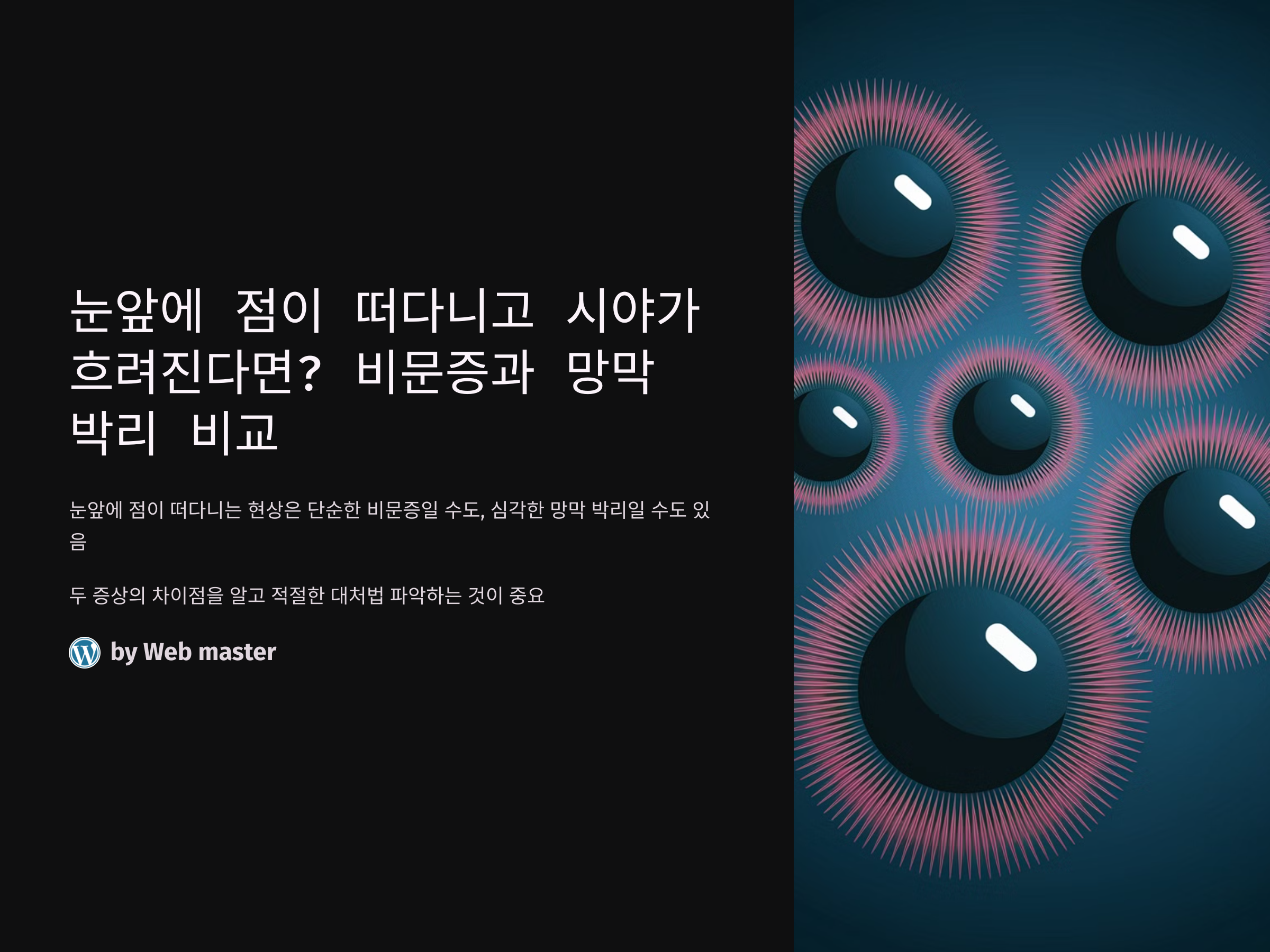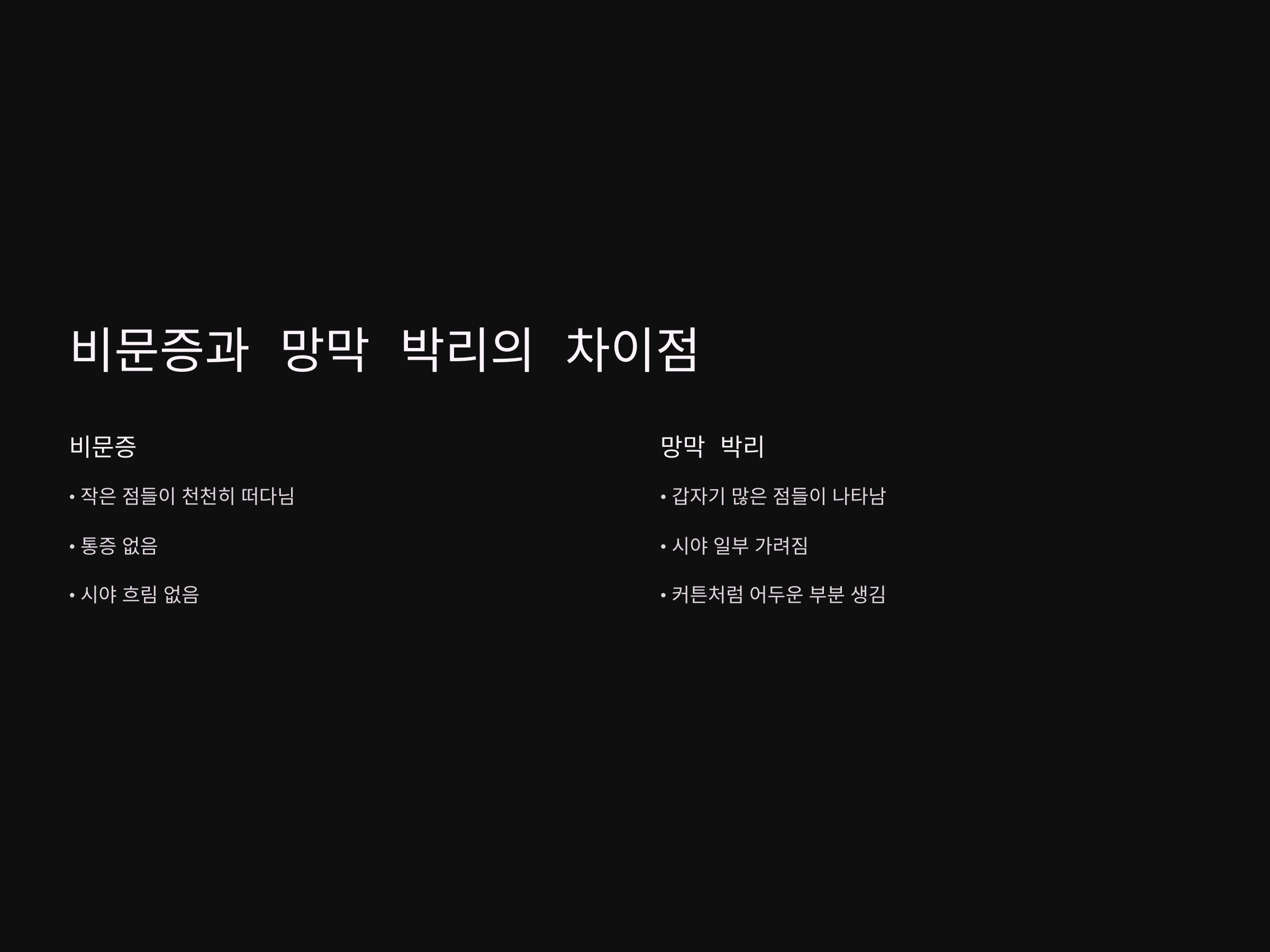 - 눈앞에 급격히 떠다니는 많은 점들: 비문증에서는 간헐적으로 작은 점들이 보이지만, 망막 박리 초기에는 큰 점이나 플래시 같은 빛이 갑자기 보일 수 있습니다.