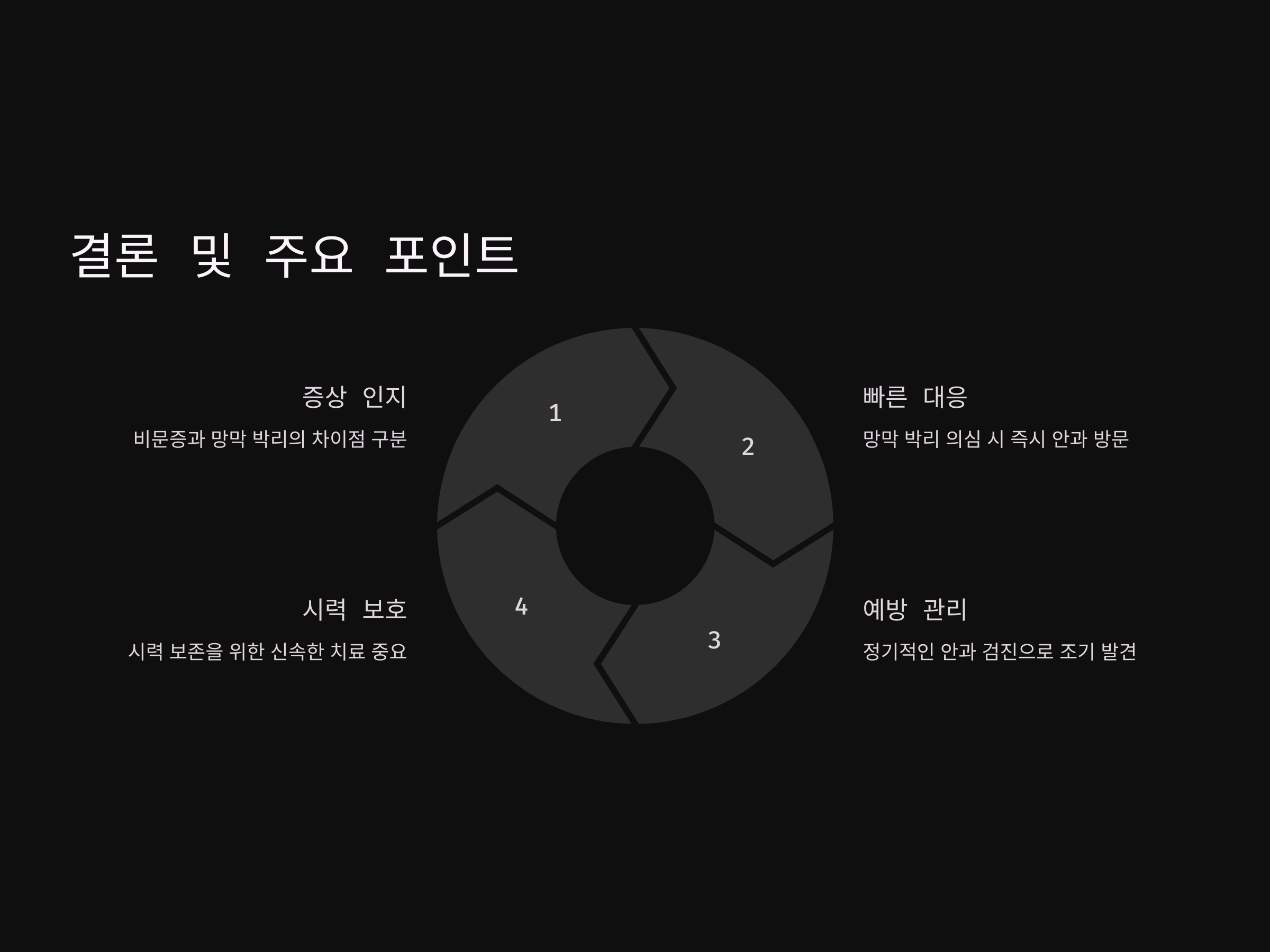 - 망막 박리는 눈앞에 떠다니는 점 외에도 시야가 흐려지고 어두운 부분이 나타나는 등의 심각한 증상을 동반할 수 있습니다. 시력에 큰 영향을 미치기 때문에 즉시 치료가 필요합니다.