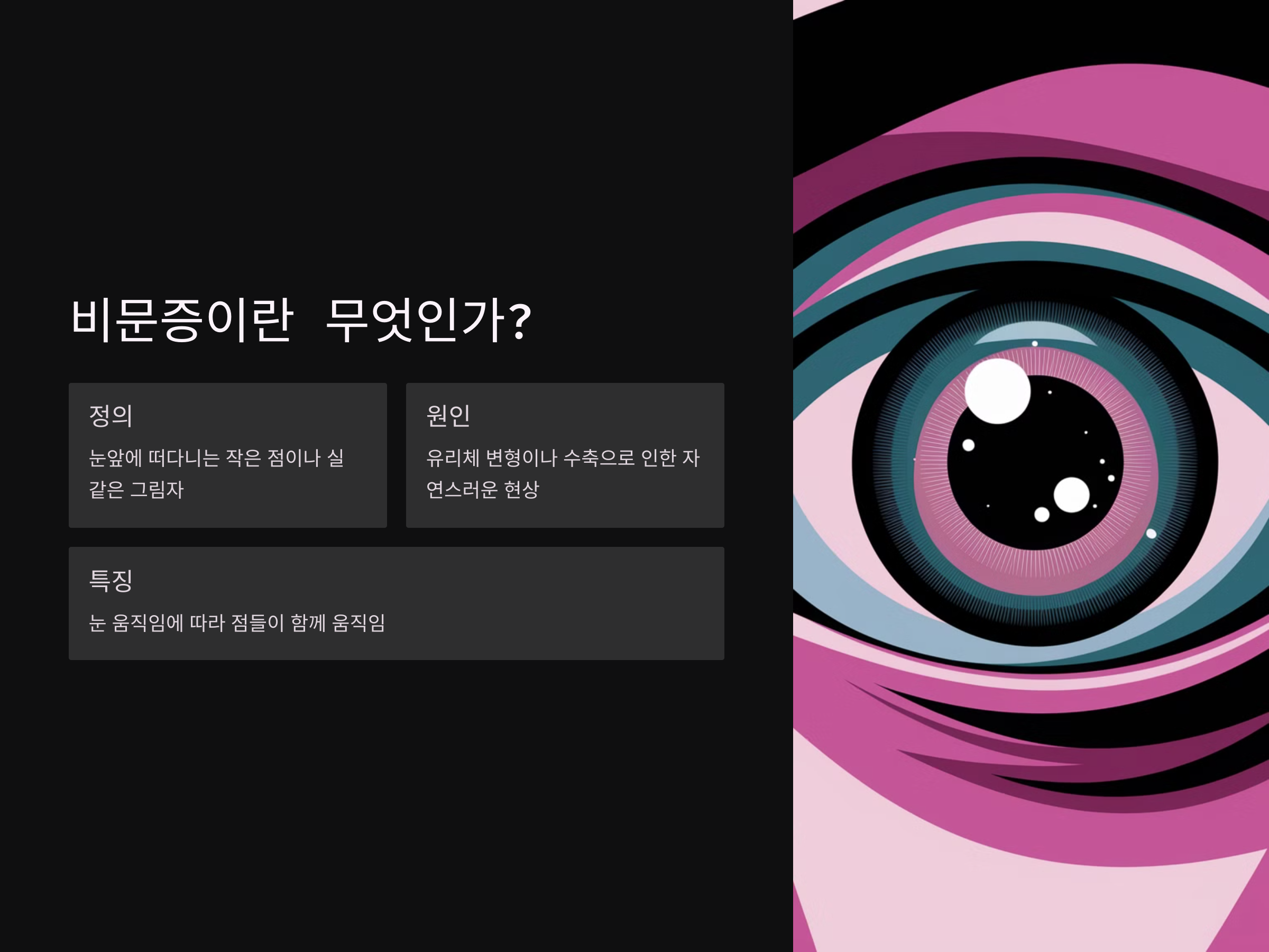 - 비문증은 눈앞에 점들이 떠다니는 현상에 그치며, 대부분 자연적으로 해결됩니다. 시야가 흐려지거나 통증을 동반하지 않으며, 눈의 움직임에 따라 점들이 따라 움직이는 특징이 있습니다.