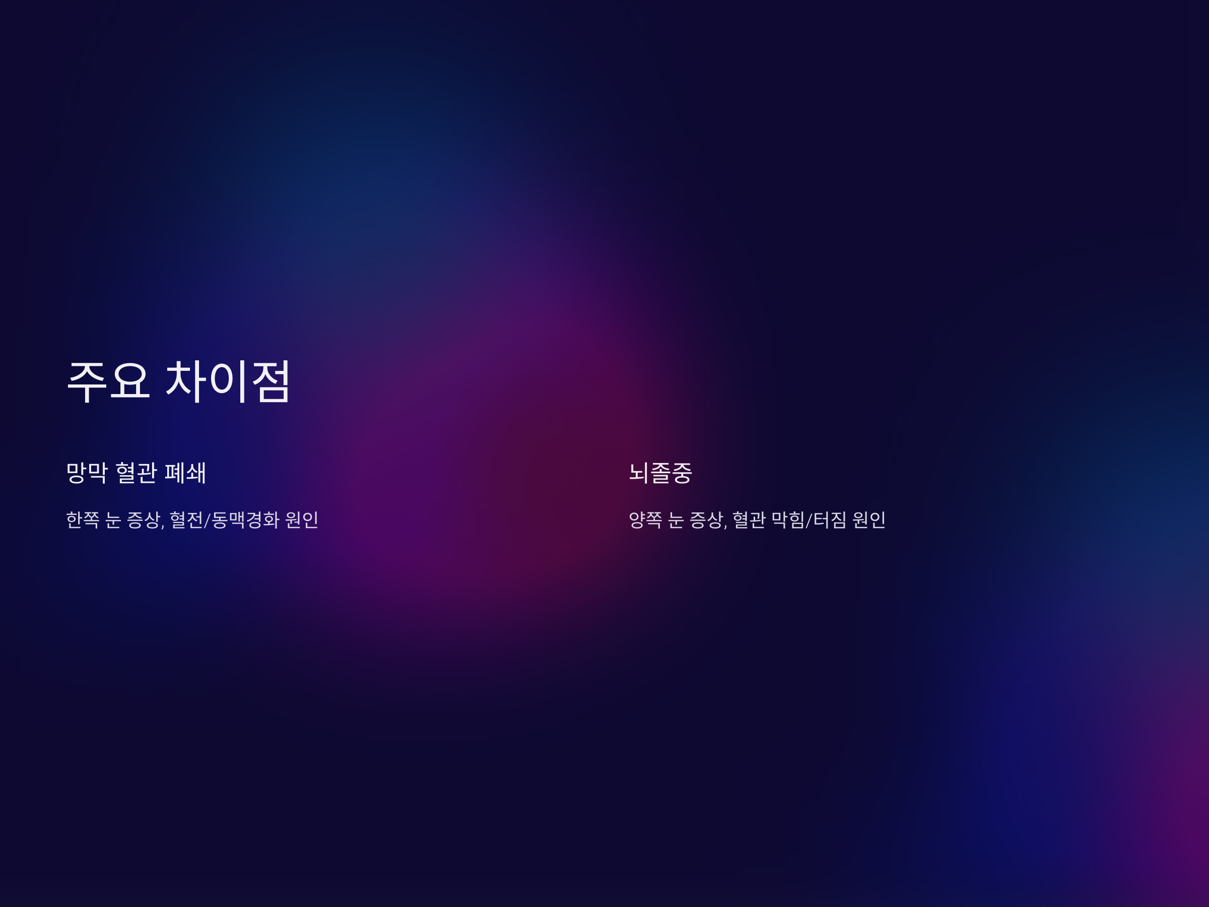 - 주요 증상: 갑작스러운 시야 장애, 한쪽 눈에서만 발생.