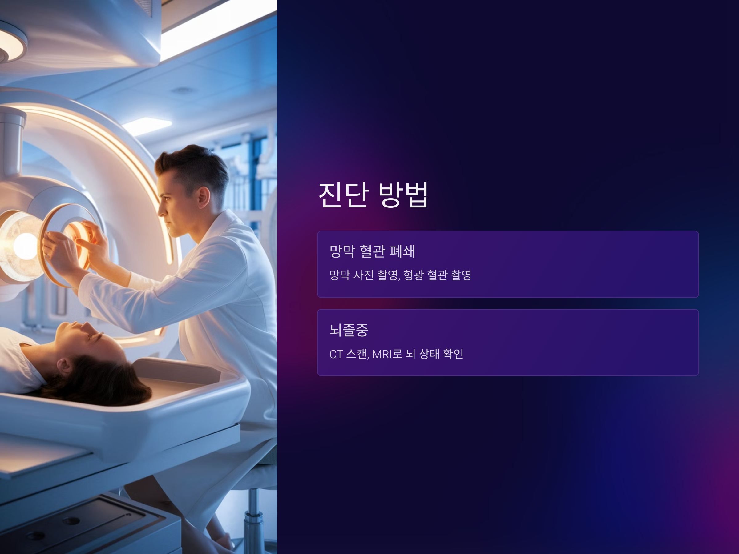 두 질환 모두 시각적 증상이 나타날 수 있기 때문에, 정확한 진단을 위해서는 여러 검사를 받아야 합니다. 망막 혈관 폐쇄는 망막 사진 촬영, 형광 혈관 촬영 등을 통해 진단이 가능하며, 뇌졸중은 CT 스캔이나 MRI를 통해 뇌의 상태를 확인할 수 있습니다.