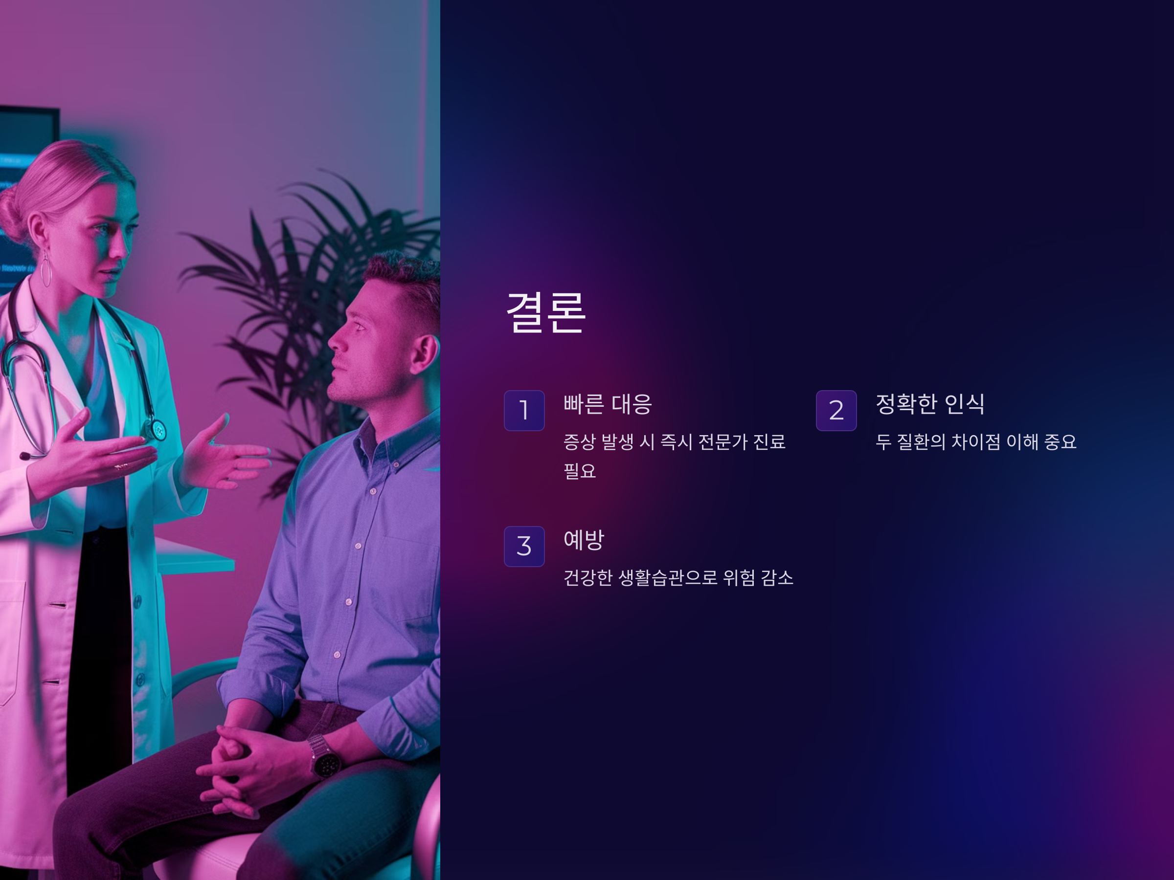 눈앞이 갑자기 검게 변하거나 시야가 차단되는 증상은 망막 혈관 폐쇄와 뇌졸중에서 모두 발생할 수 있습니다. 두 질환의 차이점을 정확히 인식하고, 증상이 발생하면 즉시 전문가의 진료를 받는 것이 중요합니다. 빠른 대응이 큰 차이를 만들 수 있음을 기억하세요. 건강한 생활습관으로 이러한 위험을 예방하는 것이 최선입니다.