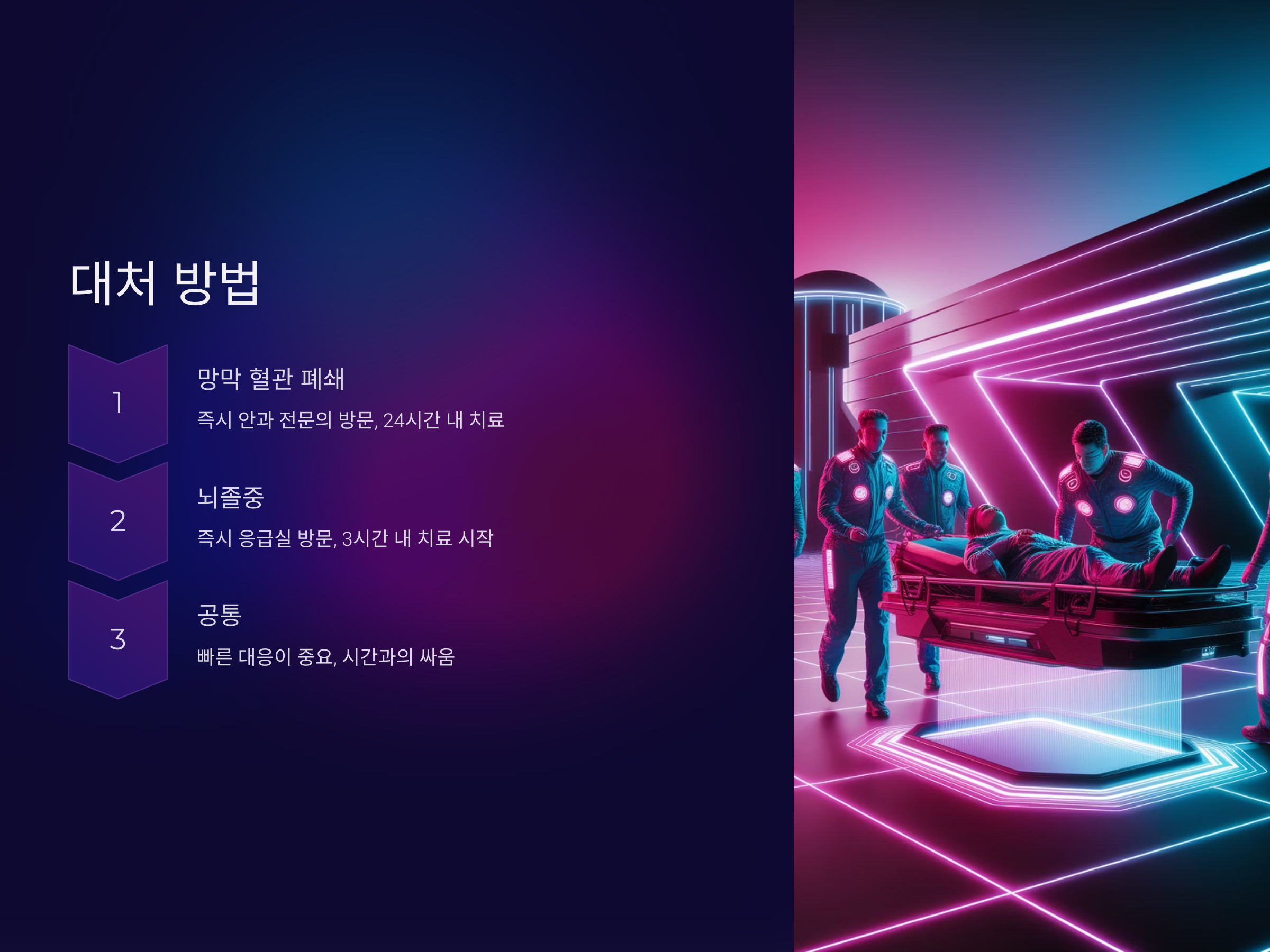 망막 혈관 폐쇄와 뇌졸중은 시각적인 장애를 동반할 수 있지만, 그 원인과 치료법이 다릅니다. 망막 혈관 폐쇄는 주로 한쪽 눈에서 발생하며, 뇌졸중은 전반적인 신경학적 증상과 함께 발생합니다. 시야에 장애가 생기면 빠르게 응급 치료를 받아야 하며, 각 질환에 맞는 치료가 이루어져야 합니다. 증상이 심각할 경우 신속한 응급처치가 생명과 직결될 수 있으므로, 무엇보다도 빠른 대응이 중요합니다.