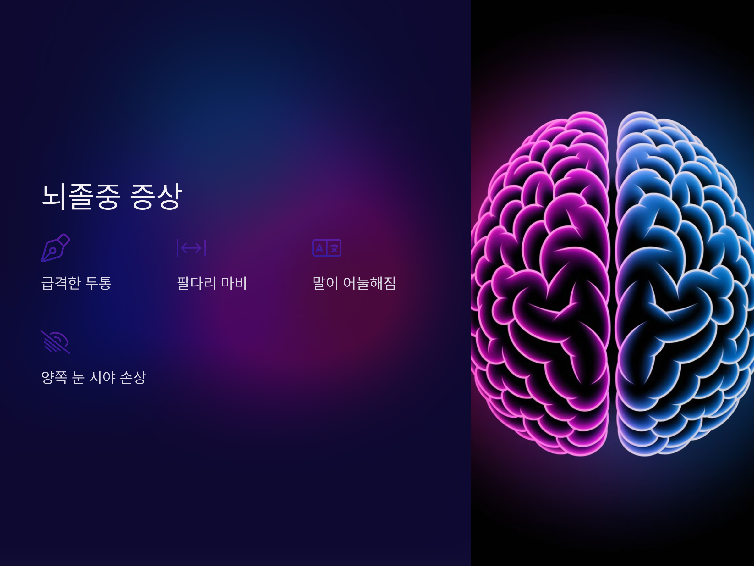 - 치료: 뇌졸중 발생 직후 즉각적인 치료가 필요, 혈전용해제, 수술 등이 필요할 수 있음.
