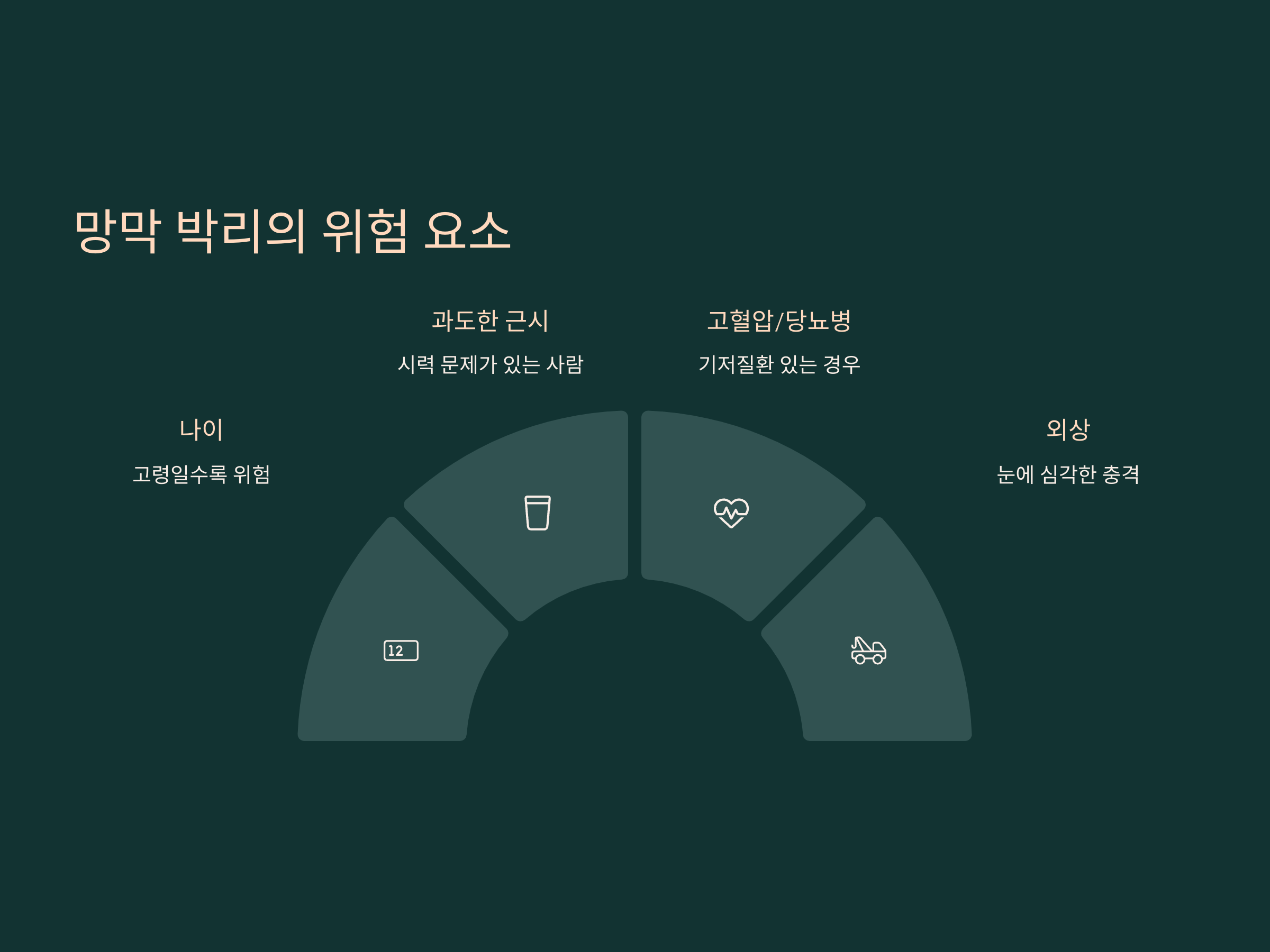 망막 박리의 위험 요소에는 나이, 고혈압, 당뇨병, 심각한 외상 등이 포함됩니다. 또한, 과도한 근시나 시력에 문제가 있는 사람은 망막 박리의 위험이 더 높습니다. 따라서 정기적인 안과 검진을 통해 초기 증상을 파악하고, 예방하는 것이 중요합니다.
