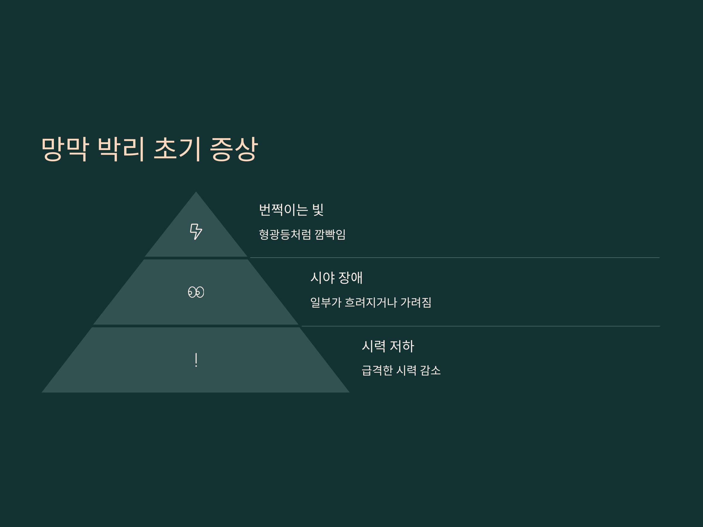 망막 박리 초기에는 비문증처럼 실선이나 점이 떠다니는 것 외에도, 깜빡이는 빛이나 시야의 장애가 함께 나타날 수 있습니다. 이는 망막이 완전히 떨어져 나가는 상태를 막기 위해 즉각적인 치료가 필요합니다.