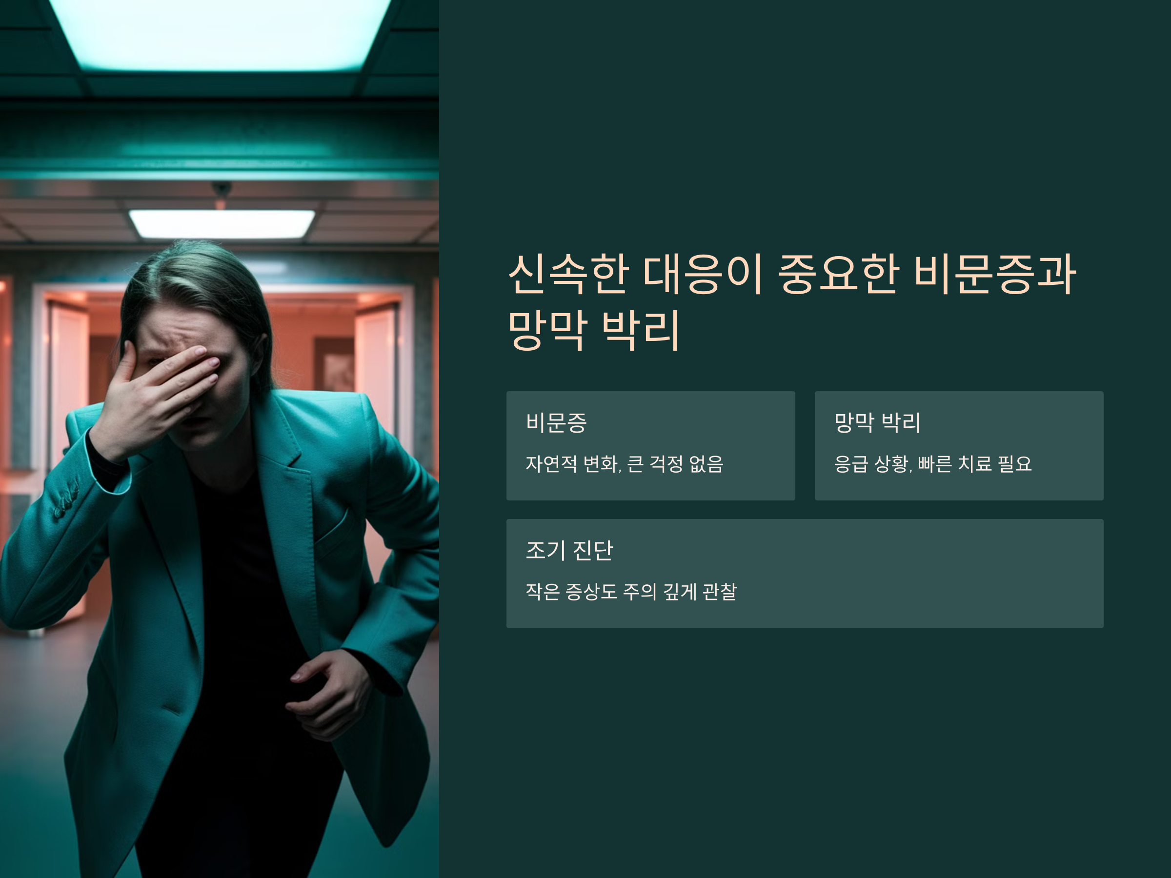 - 비문증은 천천히 발생하고 시간이 지나면서 자연스럽게 완화되는 경향이 있습니다. 반면, 망막 박리는 갑자기 증상이 악화되며 빠른 치료가 필요합니다.