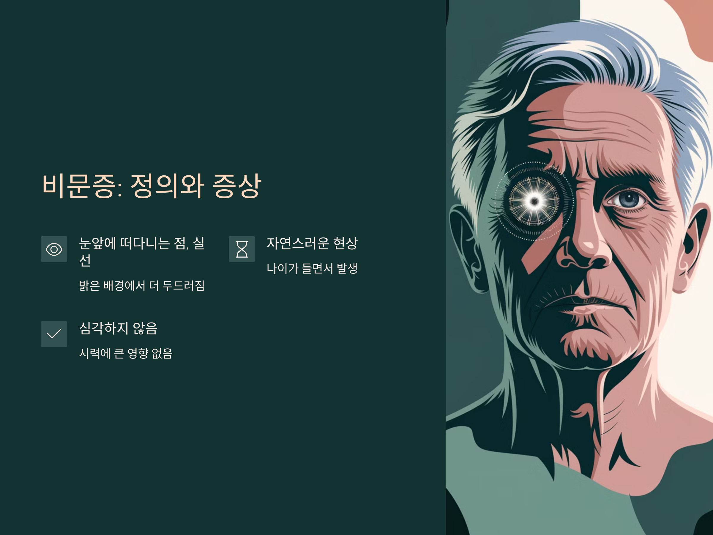 비문증은 눈을 움직일 때 눈앞에 실선이나 점 같은 형태의 그림자가 떠다니는 현상입니다. 대부분의 경우, 이 현상은 나이가 들면서 자연스럽게 발생할 수 있으며, 눈의 유리체가 변형되거나 수축하면서 발생합니다. 비문증은 대부분 심각한 건강 문제를 동반하지 않으며, 시간이 지나면서 자연스럽게 증상이 완화되는 경우가 많습니다.