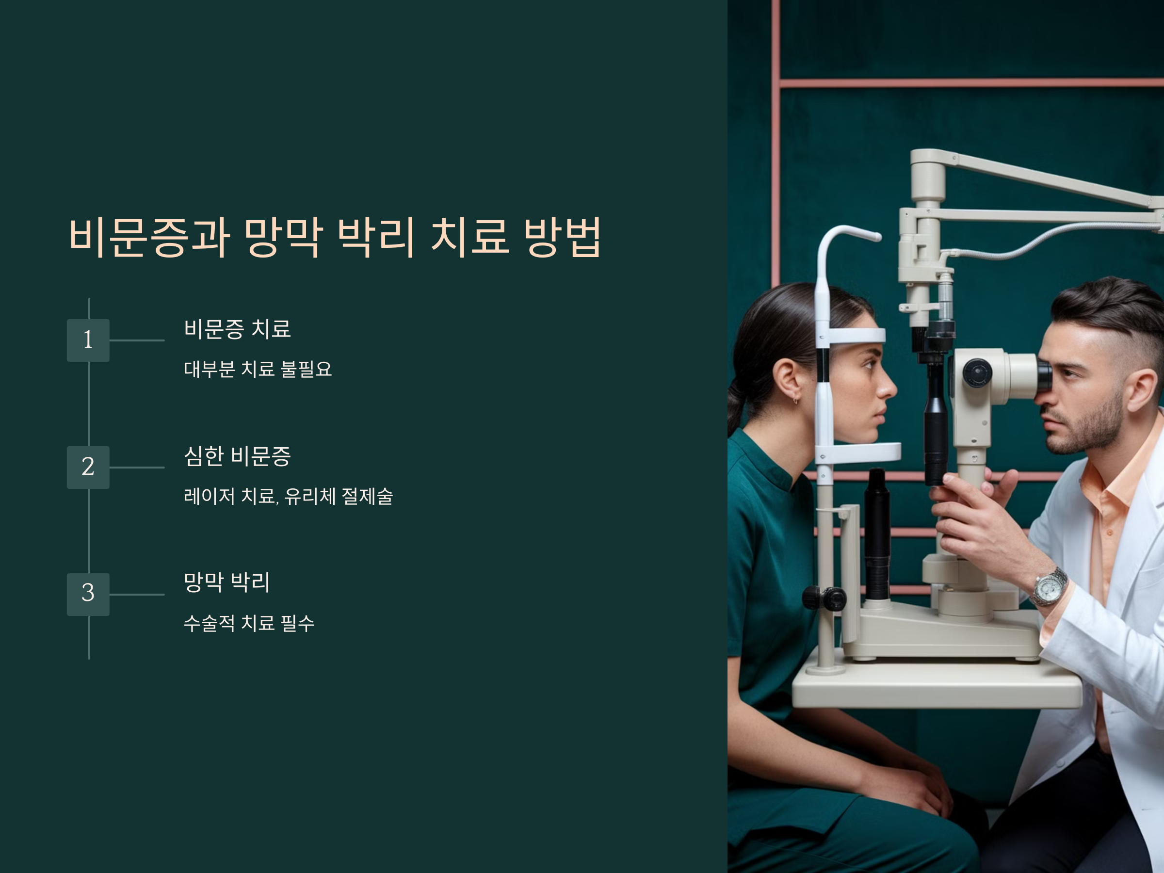 망막 박리는 빠른 치료가 필요하며, 치료를 지체하면 실명으로 이어질 수 있습니다. 망막 박리 치료는 망막을 다시 제자리에 고정하는 수술적 치료가 필요합니다. 이는 망막 박리의 정도와 위치에 따라 다르게 적용됩니다.