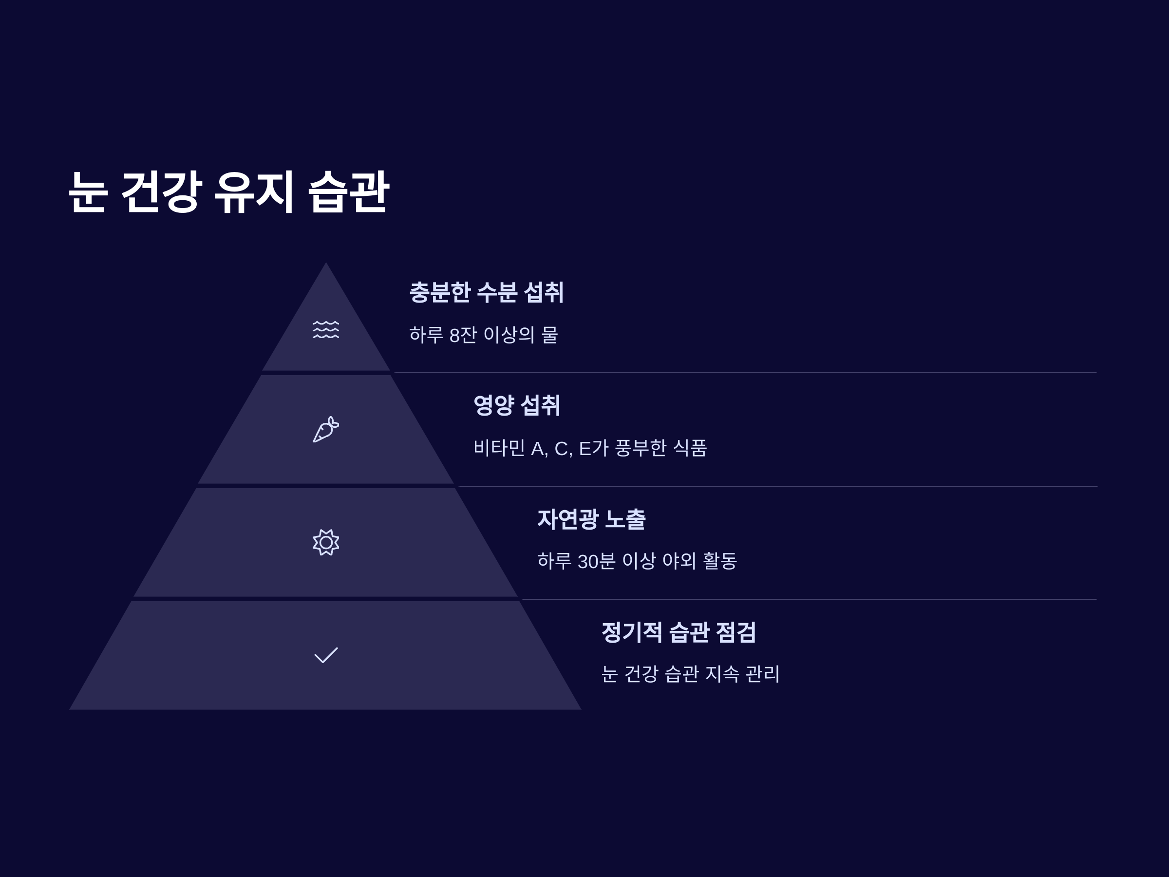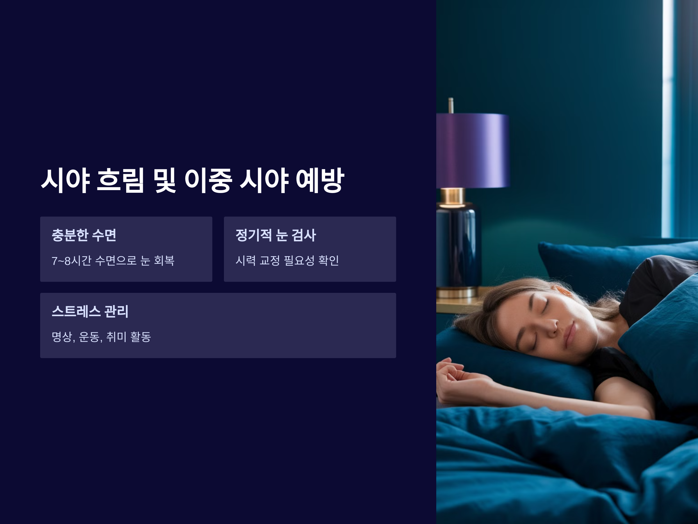 - 충분한 수면: 눈의 피로를 해소하려면 충분한 수면을 취해야 합니다. 수면 부족은 눈의 회복을 방해하므로, 7~8시간의 충분한 수면을 취하는 것이 중요합니다.