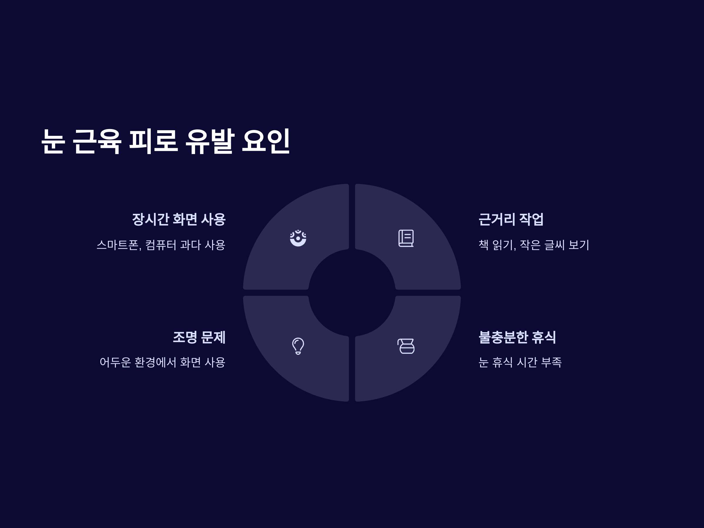 - 근거리 작업: 책을 읽거나 작은 글씨를 볼 때, 눈이 가까운 거리를 맞추기 위해 계속해서 근육을 조정합니다. 이때 눈 근육에 과도한 부담이 가해져 피로를 초래합니다.
