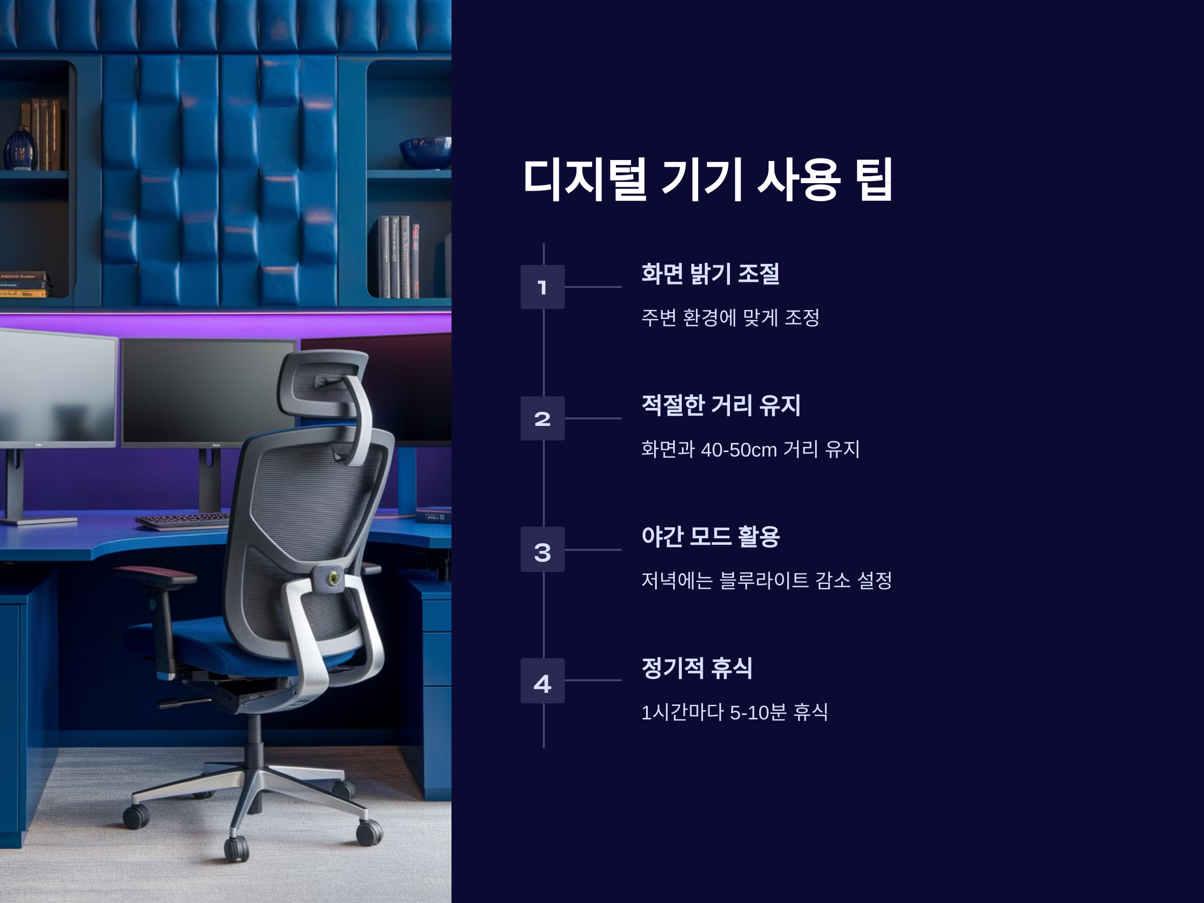 디지털 기기에서 나오는 블루라이트는 눈에 부담을 줄 수 있습니다. 블루라이트 차단 필터나 안경을 사용하는 것이 눈 건강을 지키는 데 도움이 됩니다.