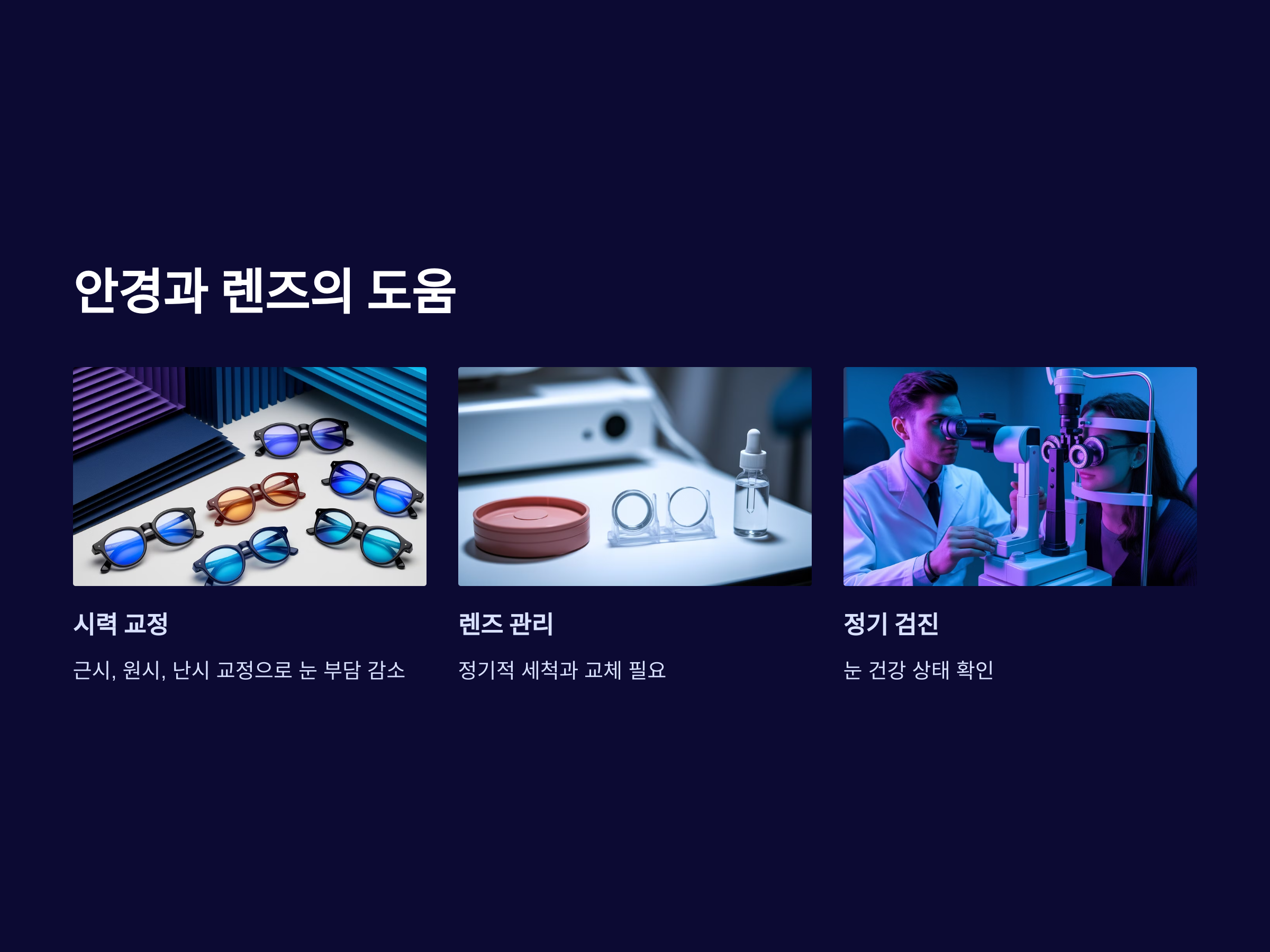 - 정기적인 눈 검사: 눈에 문제가 생기기 전에 정기적으로 눈 검사를 받아보는 것이 좋습니다. 이로 인해 안경이나 렌즈 등의 시력 교정이 필요한지 확인할 수 있습니다.