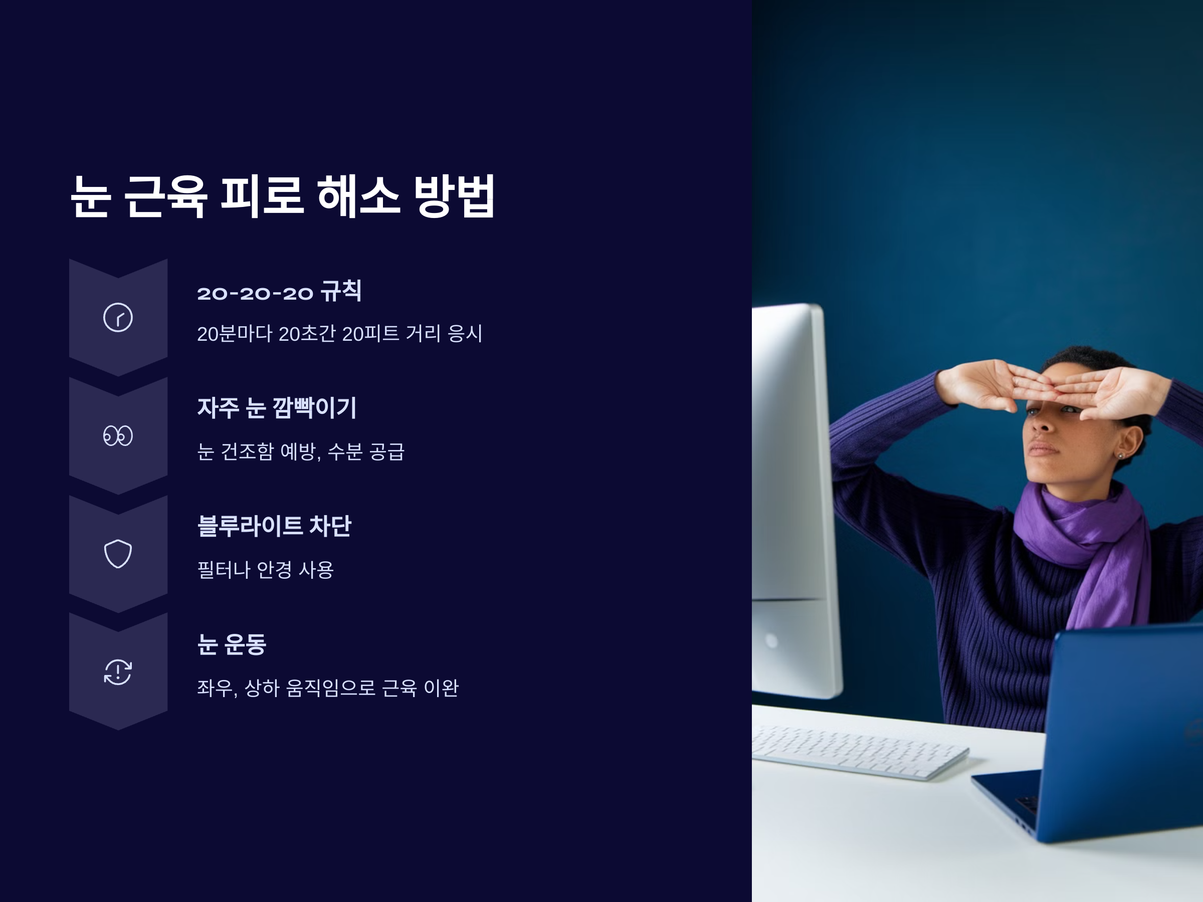 장시간 화면을 사용할 때, 20분마다 20초 동안 20피트(약 6미터) 떨어진 물체를 바라보세요. 이 규칙은 눈의 피로를 예방하고 눈 근육을 이완시키는 데 도움이 됩니다.