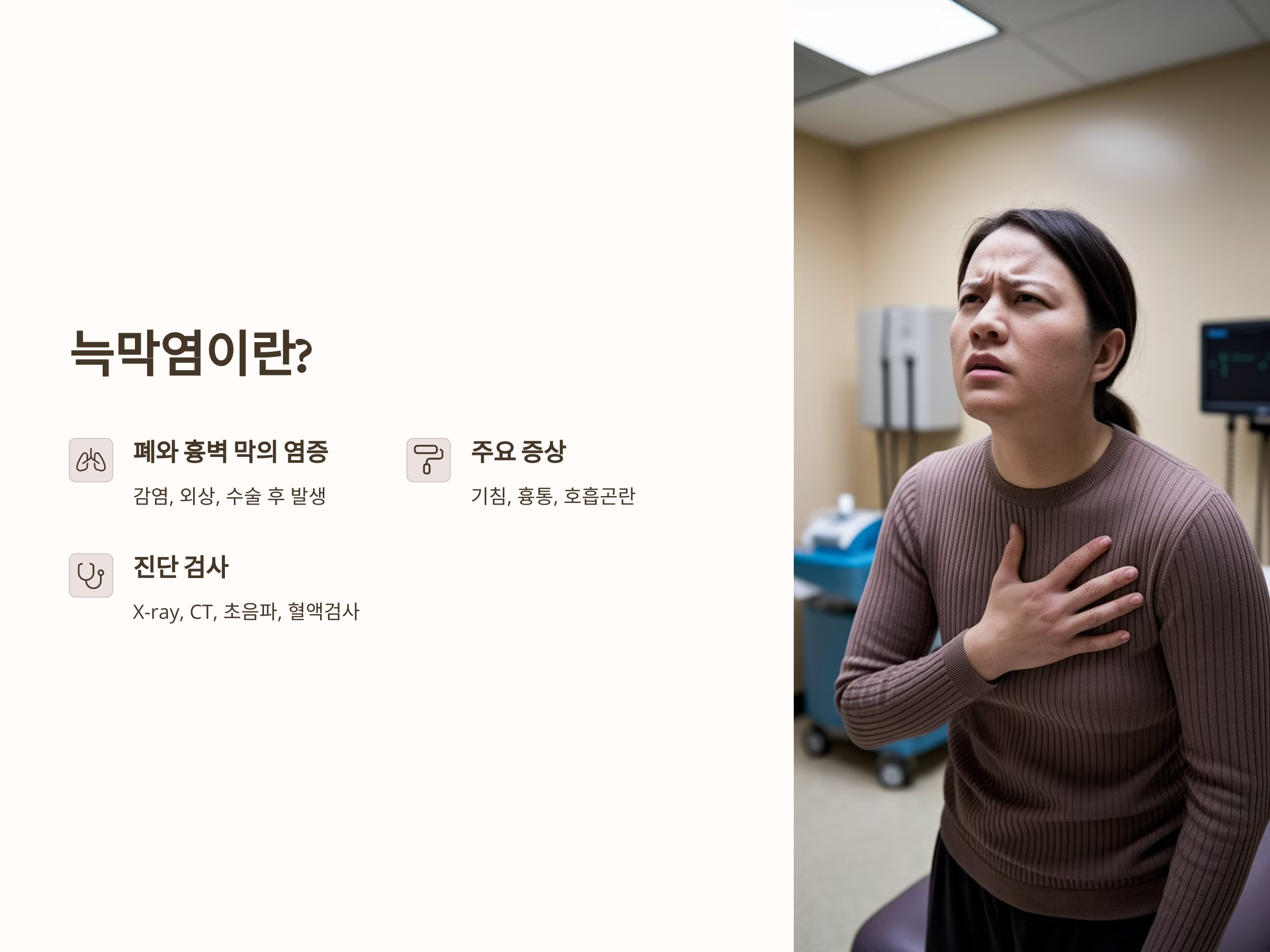늑막염은 치료가 늦어질 경우 폐 기능에 심각한 영향을 미칠 수 있기 때문에 조기에 치료를 받는 것이 중요합니다. 늑막염의 진단을 위한 주요 검사는 흉부 X-ray, CT 스캔, 초음파 검사, 혈액 검사 등이 있으며, 이를 통해 염증의 원인과 범위를 확인할 수 있습니다.