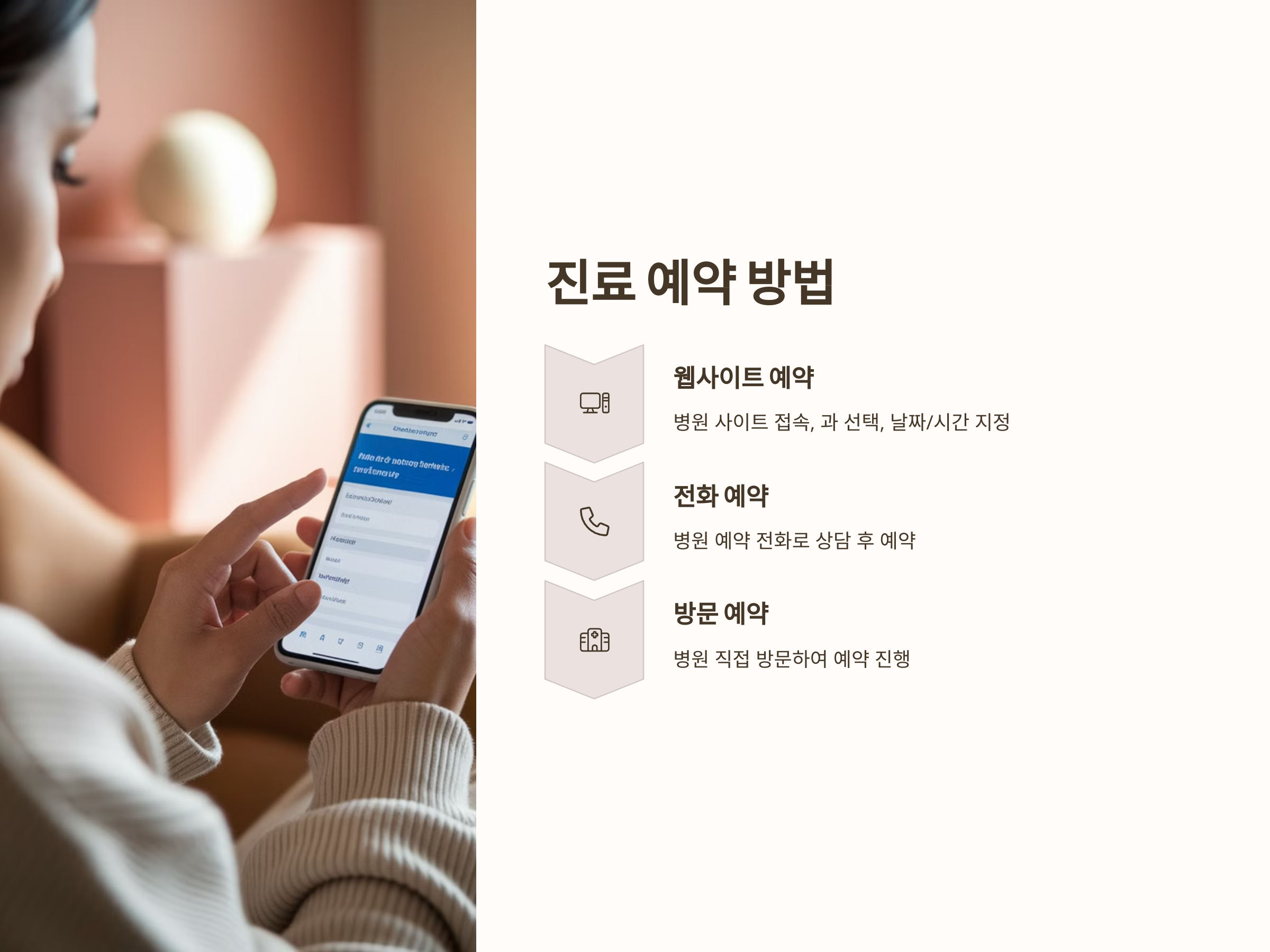 웹사이트 예약이 어려운 경우, 병원의 예약 전화를 통해 예약을 진행할 수 있습니다. 전화 예약 시에는 예약 가능한 날짜와 시간, 필요한 서류를 확인한 후 예약을 진행합니다. 이 방법은 직접 상담을 통해 세부사항을 확인할 수 있어 편리합니다.
